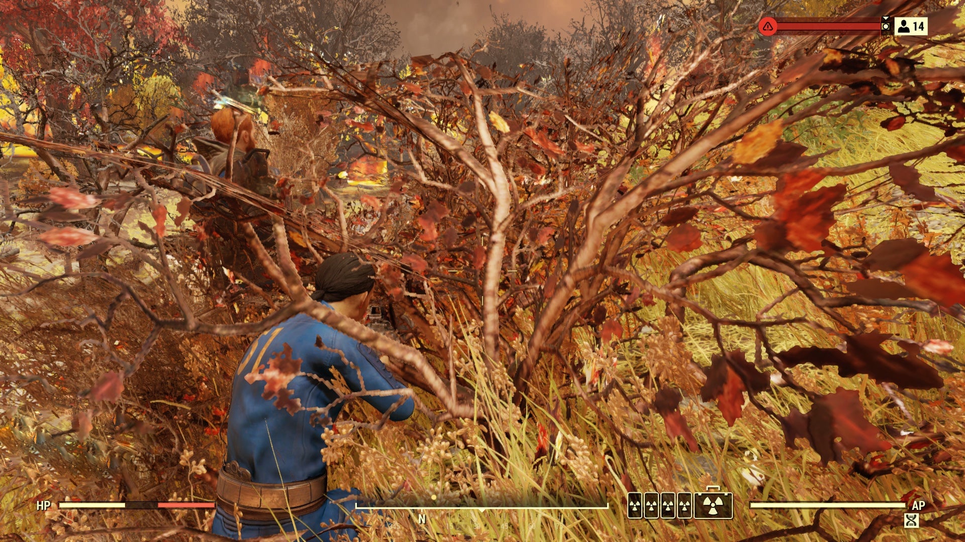 We were on the main road just south of the New River Gorge Resort when I spotted something moving up ahead. Unable to communicate with Bill (no mic, remember?), I took out my sniper rifle to try and pin the the stranger down. I was quick enough to snag his arm before he could dive back behind a tree, but not quick enough to stop Bill from getting riddled with bullets. As Bill fired back from the road, I tried to flank our mystery vault dweller. I don’t know which one of us killed him, but I do remember being giddy with excitement about it. This was going to work. With Bill’s help, anyway.