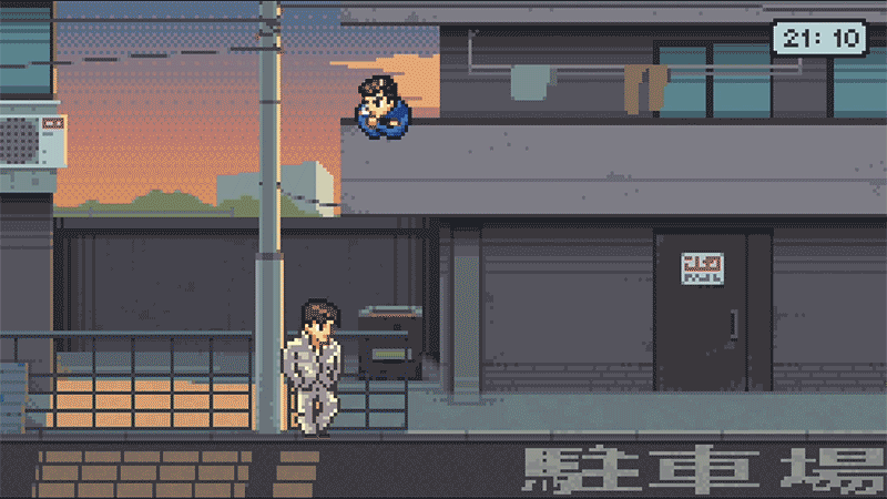 The texture of literature is palpable in the quietest moments: press down on the d-pad (don’t play this with the analog stick, please; Kunio-Kun wouldn’t approve) while standing in front of your dormitory balcony to put your arms on the railing. Press B to light a cigarette. Now listen to the smooth jazz and watch the pixel sun go down while a man waits patiently beneath a street lamp below.