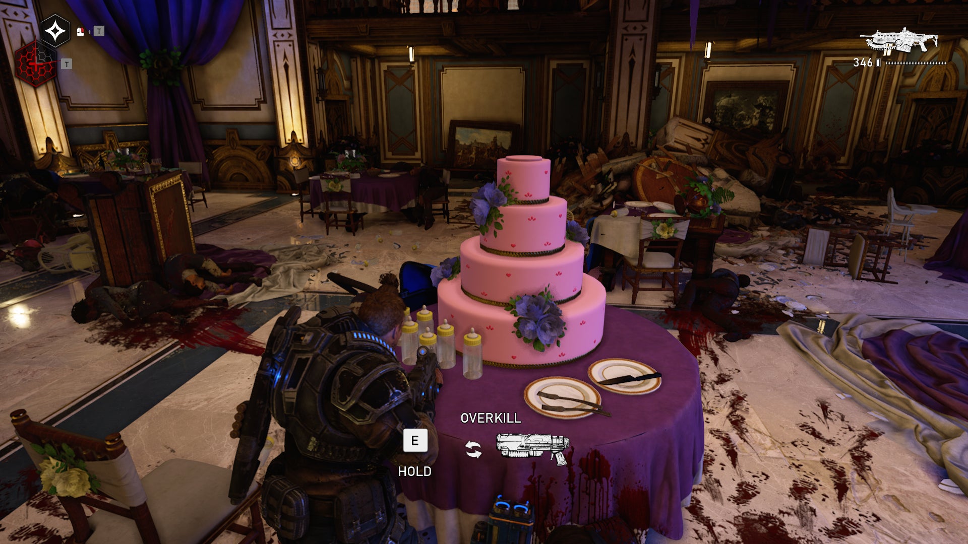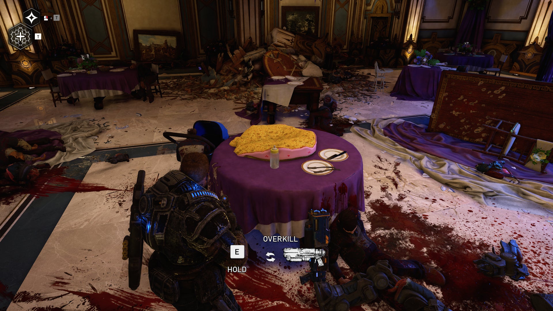 Not all the food was small and tucked away. Some food was bigger and easier to spot, like a giant cake. Getting a photo of this cake proved tricky. I wanted to really get close to it and snap a nice screenshot. Gears 5 doesn’t have a photo mode, so I was forced to clear out the area before snapping a nice picture.