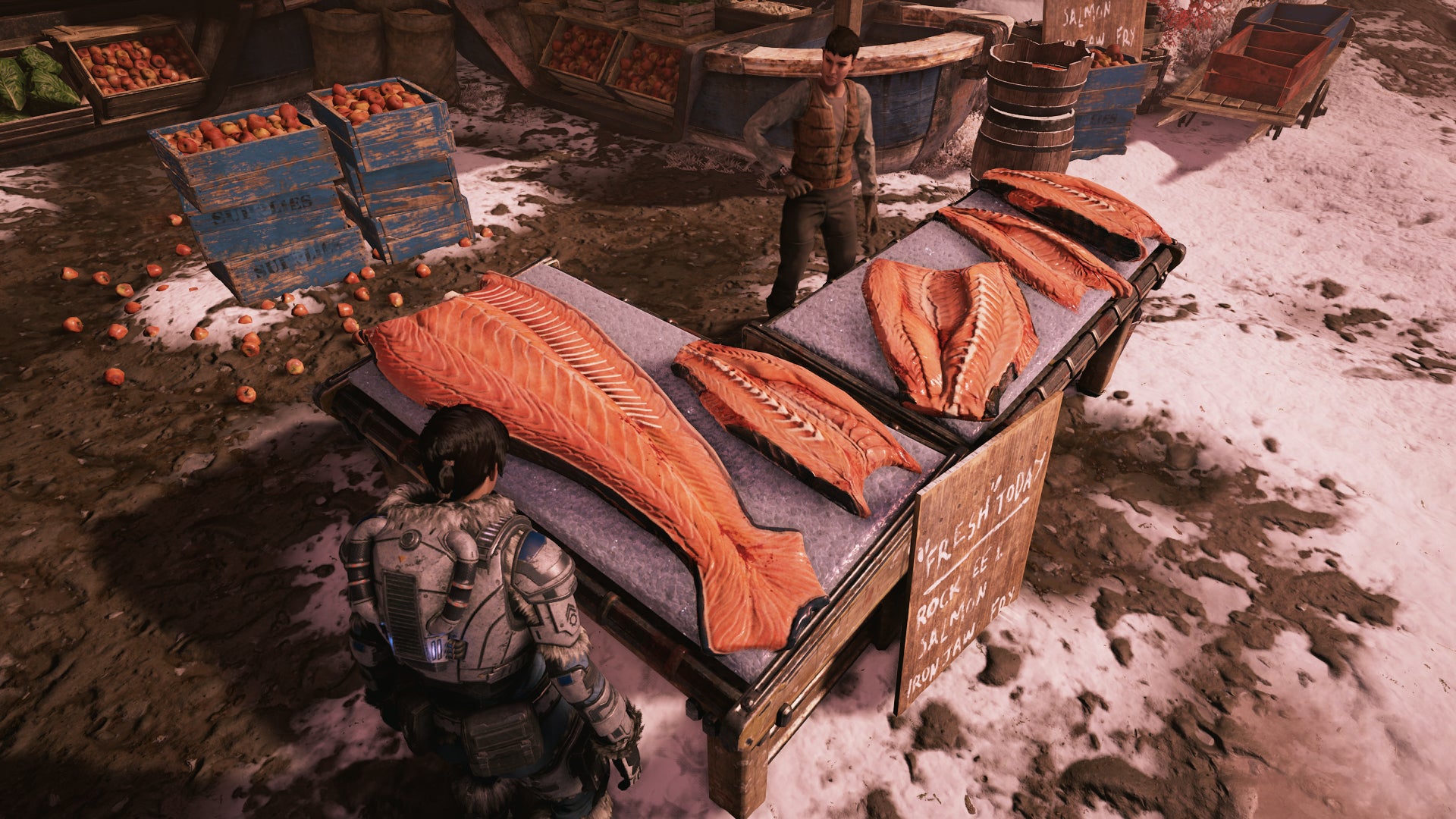 Early on in Gears 5, you are exploring an urban area filled with hotels, museums, apartments, and stores. This is where I first noticed a stack of desserts on a small table.