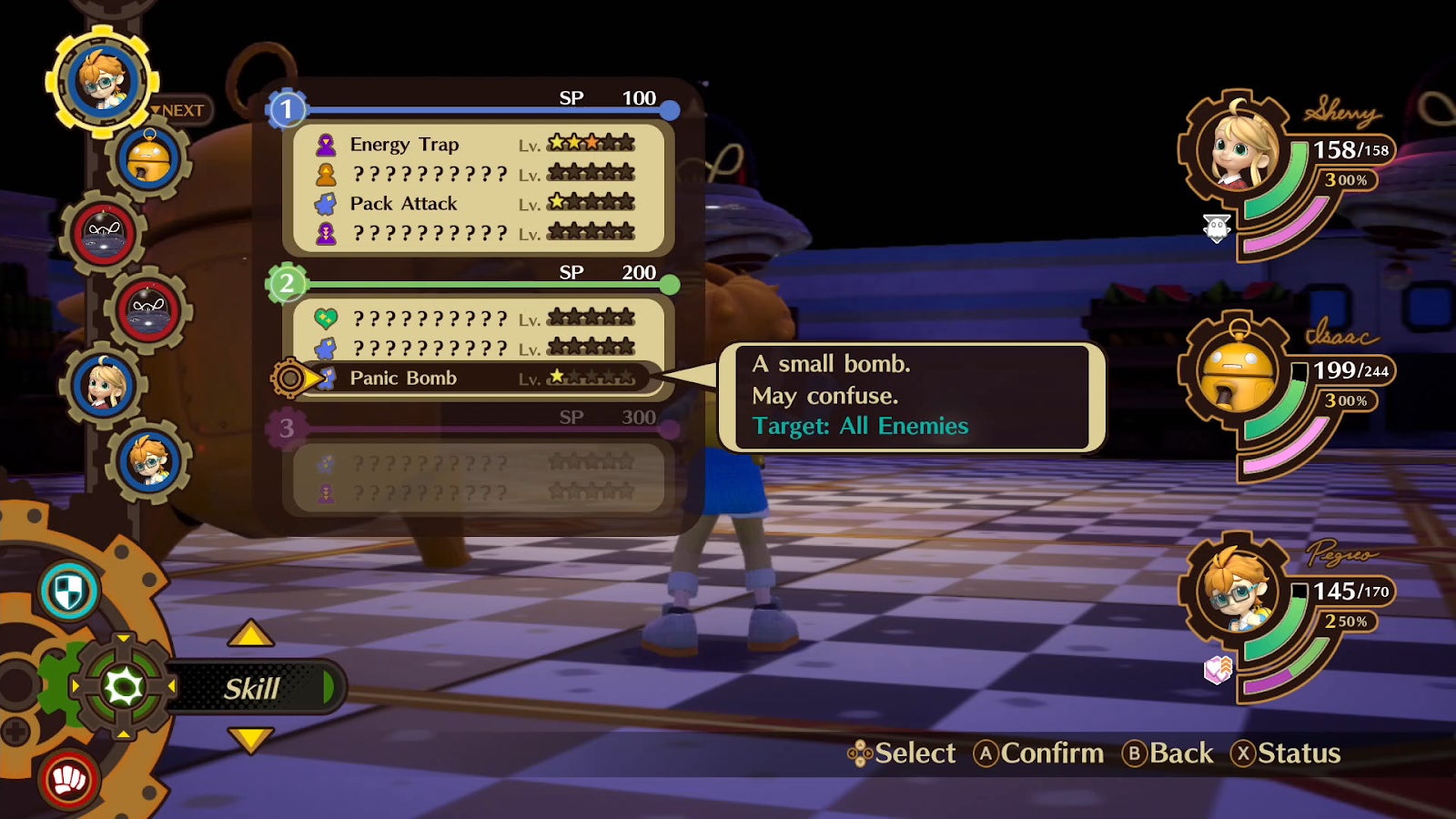 It keeps getting better from there. The battles are simple at first, little more than waiting my turn to hit the attack button, but soon Sherry and friends begin learning special skills, defining their roles in combat and unlocking new strategic choices. Pegreo, for instance, is a timid, fearful character who follows Sherry into battle out of loyalty when it’s obvious he’d rather flee. His moves reflect his personality; for example, his Panic Bomb ability harnesses his fear into a massive attack against all enemies with a chance to cause confusion. His love of gadgets shines in skills like Energy Trap, a device that damages an enemy whenever they use one of their own skills, perfect for boss battles.