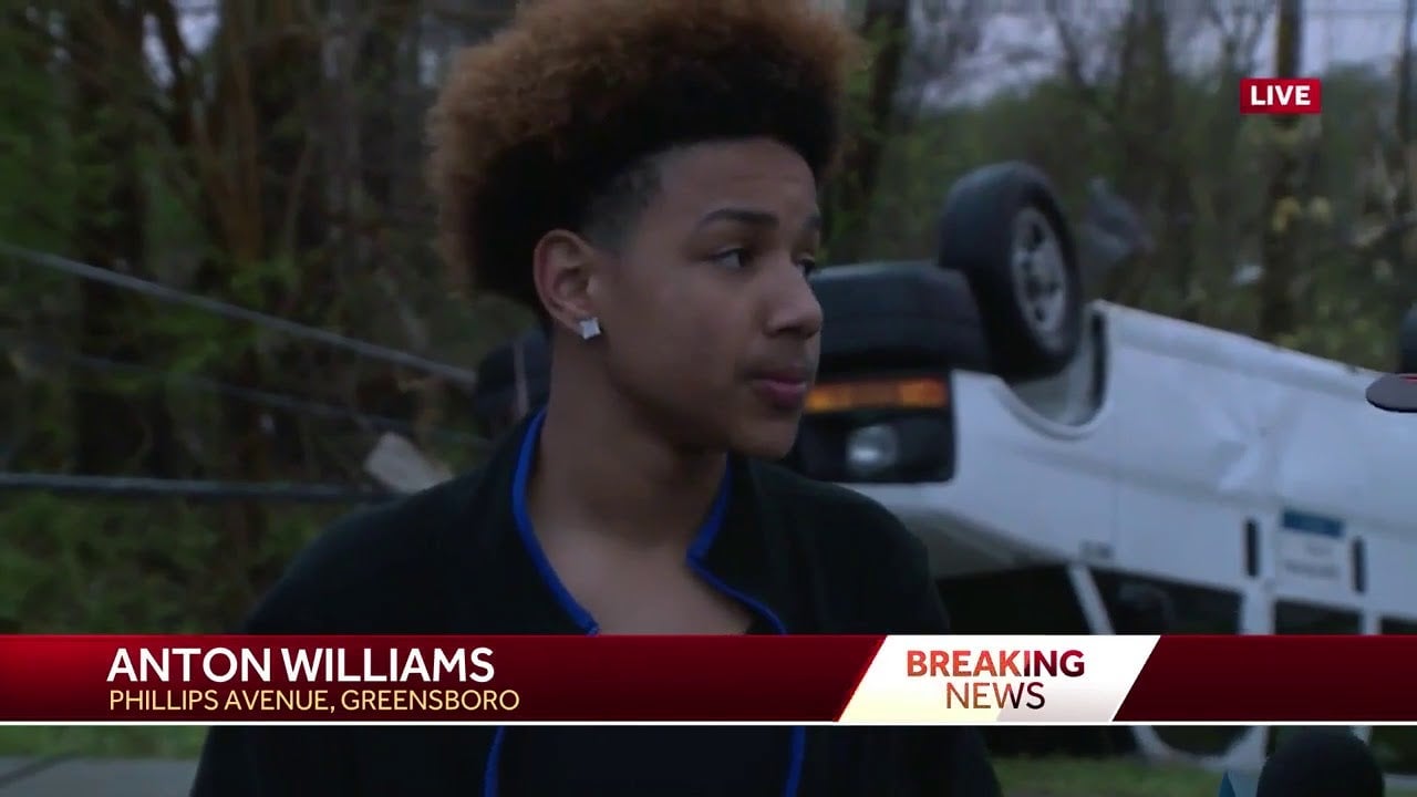 In an interview with the local news network, teen Anton Williams stands in front of an overturned van near his home. The reporter explains that the house behind them had been lifted off its foundation, adding that Anton’s house had lost siding and was pierced by a power line.