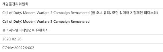 South Korea’s Game Rating and Administration Committee has rated Call of Duty: Modern Warfare 2 Campaign Remastered. The country’s ratings board often inadvertently leaks unannounced games it rates. This is probably no exception. [Thanks Sang for the tip!)
