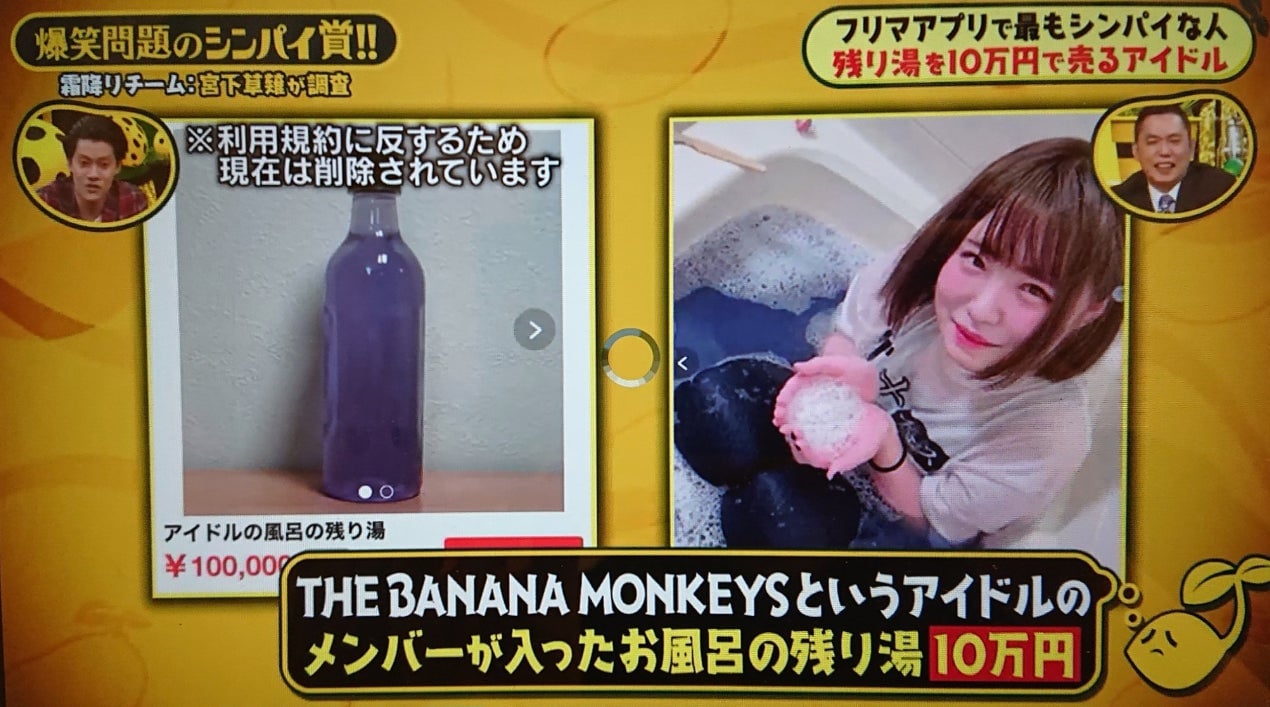 In January 2019, pop group the Banana Monkeys offered their bath water for 100,000 yen ($930) online. It went under the listing “Leftover hot water from an idol bath,” and two members of the group appeared in a YouTube clip, fully clothed in the tub. Member Tenka no Chanyuki says this wasn’t the group’s idea…