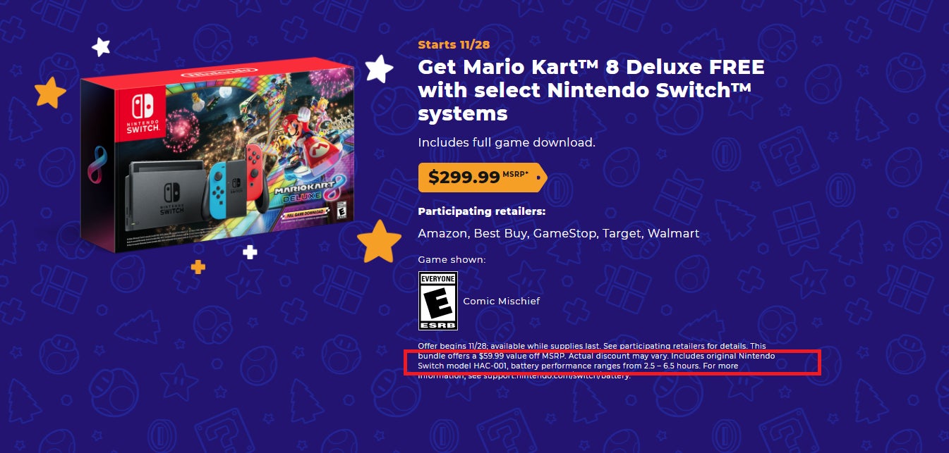 There’s a $300 Switch bundle that includes a digital version of Mario Kart 8 Deluxe on sale this Black Friday at a lot of stores. It would be a solid deal, but there’s a catch: The bundle includes the original model of the Switch, with much worse battery life than the other ones currently on shelves.