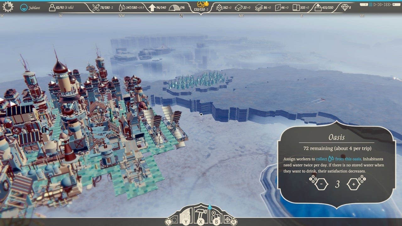 Airborne Kingdom stumbles on Switch in exactly the ways you’d expect Airborne Kingdom to stumble on Switch. I’ve been playing entirely handheld on a non-OLED Switch. As a result, the vistas are in some spots muddy, but in all cases significantly less crisp than the stunning Ghibli-inspired visuals this game sports on high-end PCs and next-gen consoles. Placing pathway tiles causes the machine to sputter; more than once, I’ve felt that laying out a new swath of roadway would cause my nuts-and-bolts city to tumble out of the sky. The draw distance and load speeds could be better. I also imagine some of the fundamentals—like clicking through the many menus—are better-suited for a mouse and keyboard, rather than the not-terribly-responsive Joy-Con thumbsticks.