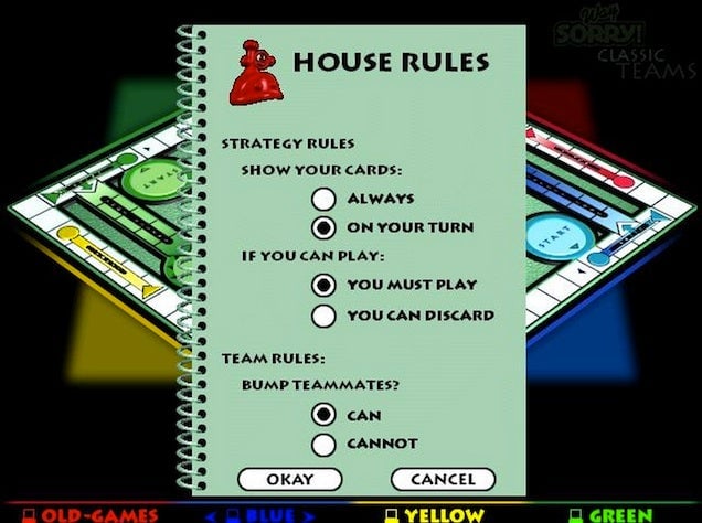 The CD-Rom contains two different variations of the game — classic Sorry!, of course, and Way Sorry!, which adds extra cards with different powers and abilities. My favorite newcomer is the Happy card, which gives one of my pieces immunity for a single turn. Beyond this, there are customizable options, including many of the popular house rules that I followed in elementary school with my friends. The key word here is ‘optional’ — you can always play the official version if you want to.