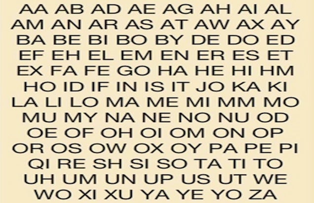 But most importantly, I learned about all of the two-letter words that I never knew existed. The first time I saw the computer playing two-letter words (and racking up hundreds of points), I was shocked; I would never have considered them playable. But once the anger wore off, I got with the program. Here, for your viewing pleasure, are the two-letter words that are legal in Scrabble:
