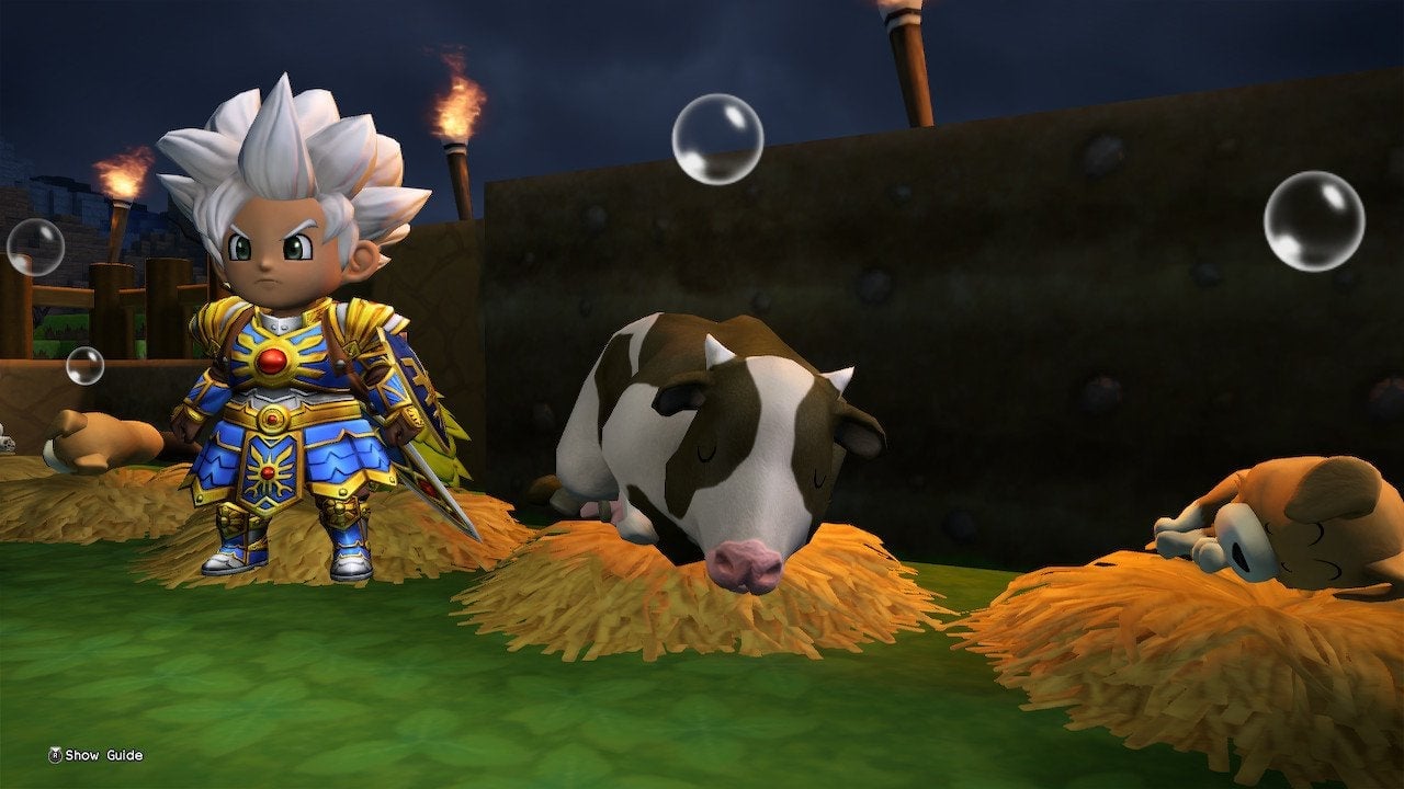 With two items left—green dye and a cow—I went back to climbing. Along the way I battled a golem who almost killed me. Then I laid eyes on it: a new, very-much-alive cow. It was hanging around a lava pool, of course, because I have surmised that Dragon Quest Builders 2’s cows have a death wish. I tried to approach it but had to save its life by pouring water over the lava it tried to walk into. This set off a chain reaction of the cow being scared by my presence, and it trying to run headlong into the lava for a gruesome, scorching death. Enemies surrounded us and began attacking, too, but somehow, I managed to befriend it and escape. My worries did not end there.