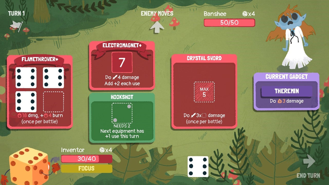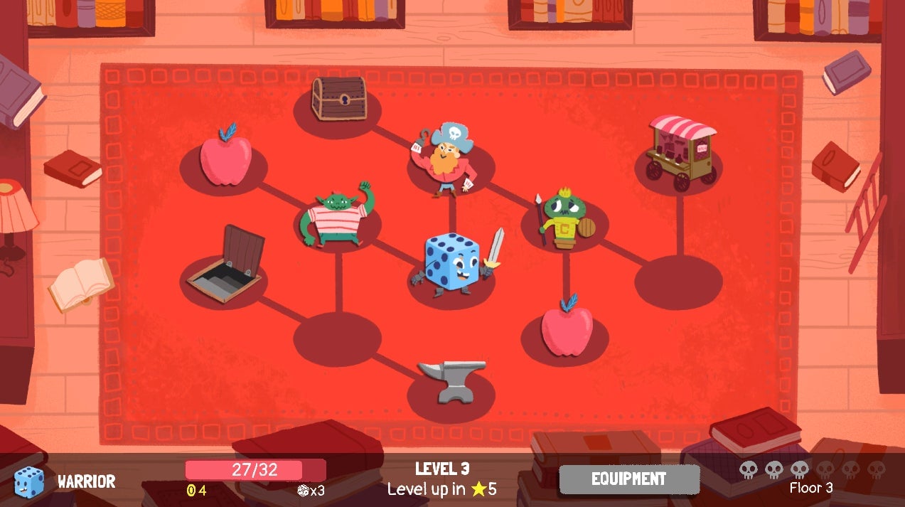 While on the surface it seems to have the most in common with games like SteamWorld Quest and Slay the Spire, its smaller dungeons and bigger focus on moment-to-moment decision making during battle makes it feel more in-line with the math-based puzzle game Threes!. You’re only presented with a few options at any given time, whether that’s deciding to fight an extra enemy to get to a treasure chest or how to mix and match the three dice you’ve rolled with the three cards you have.