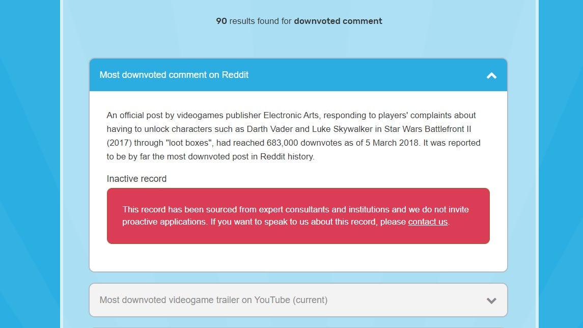 If you create a free account you can look up every record on the Guinness World Records website and find the EA record, listed under “Most downvoted comment on Reddit.”
