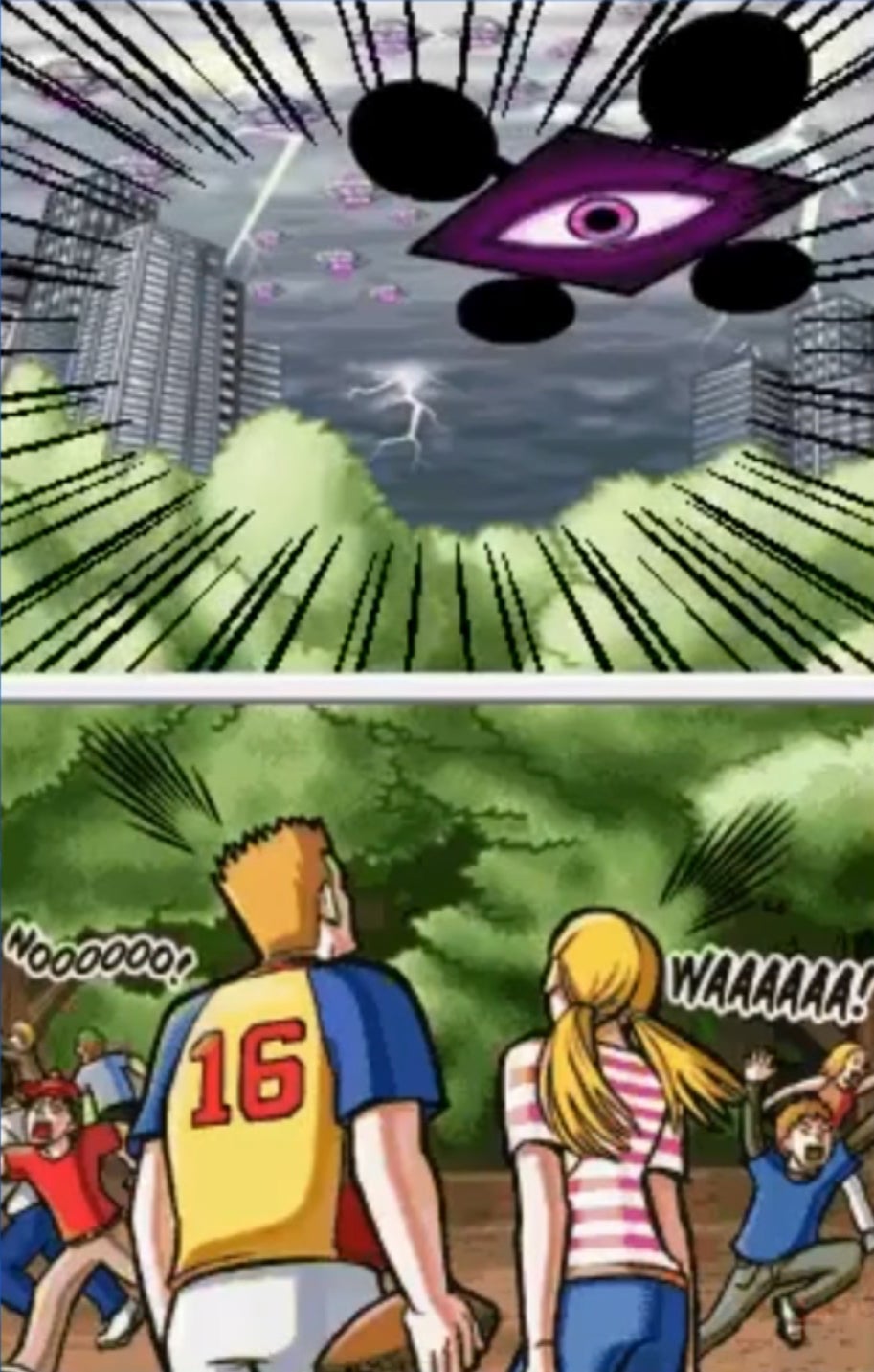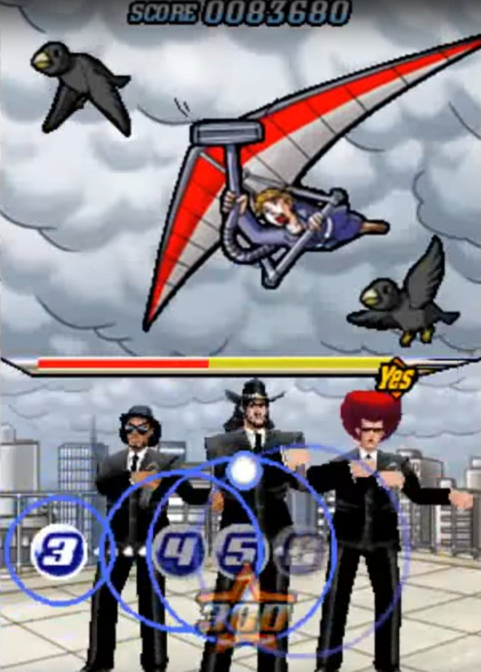 What I liked most is that the Elite Beat Agents don’t directly help the people in question. Instead, they provide inspiration and support through their dance and music. Made up of three agents named Spin, Chieftain, and J and led by Commander Kahn, the EBA travel everywhere in the world via dance, rocketpack, and blimps. One of the most outlandish operations has the EBA help change the weather for a reporter who made up a fake forecast so she could spend a weekend with her son outdoors. She vacuums up clouds in a glider and gets help from the air force to clear the way for sunshine, all set to “September” by Earth, Wind, and Fire.
