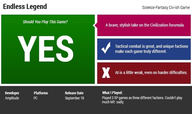 But right now, in a world where the actual studio responsible for Civilization put out such a timid spin on the seriesā formula, to play something thatās so brave in its intent to spice it up, and which pulls so much of it off with such style, has me not caring about those few rough edges. Endless Legend is a strategy game that you may never have even heard of, let alone played, but if youāre into Civilization I canāt recommend it highly enough.