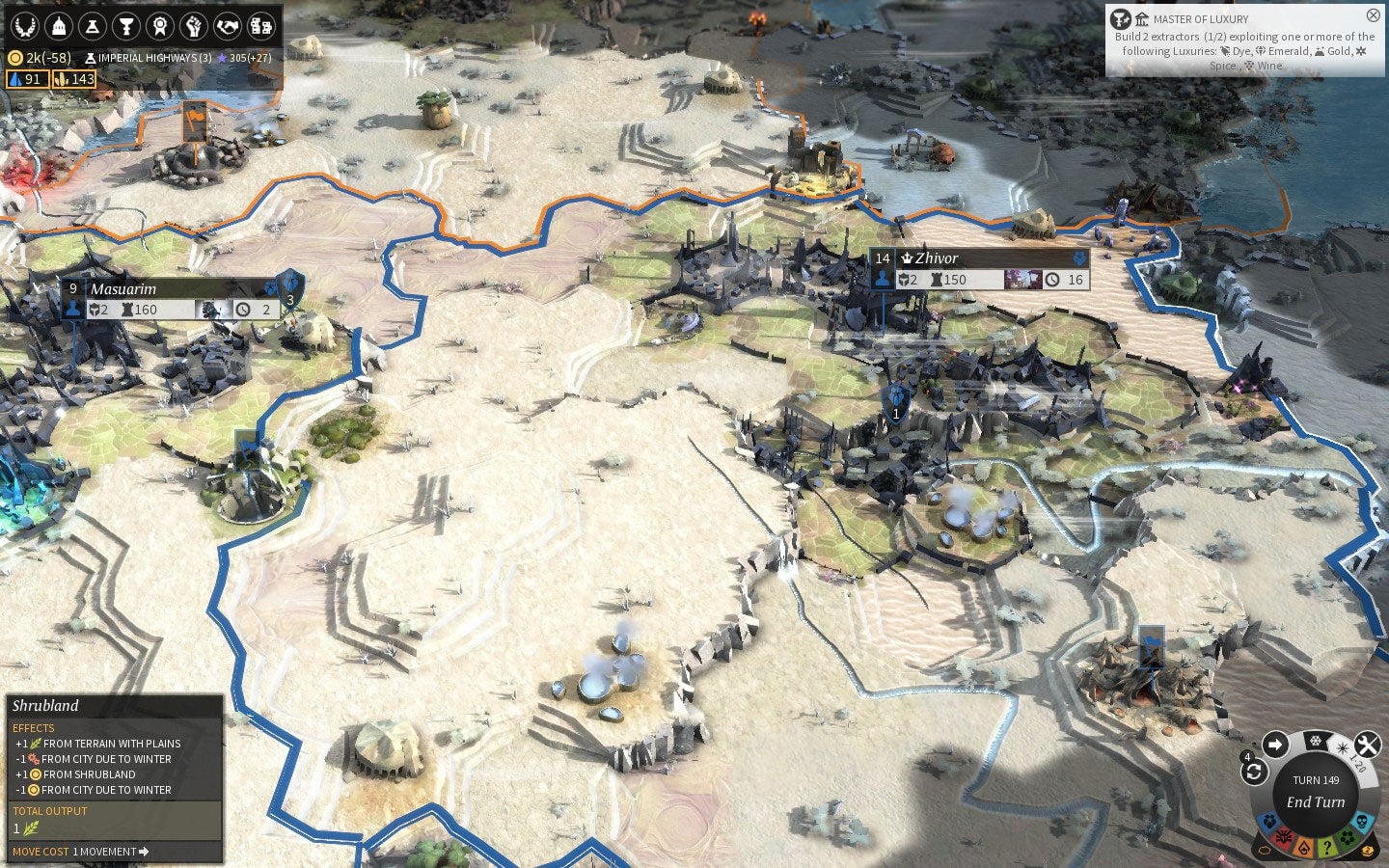 Winter is Coming – The game has seasons. Sort of. You spend most turns enjoying summer, where the sun is shining and your food is plentiful, but every once in a while winter kicks in (see below), and itās brutal. Your food production drops, and your units can barely move across the map. Itās a really well-timed mechanic, as it happens enough to make it strategically useful during wars, but not often enough to become a drag.