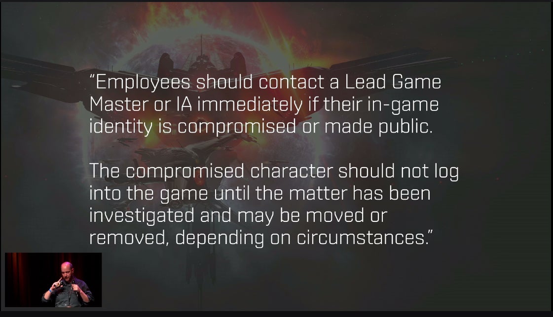 Anonymity is a unique problem in EVE. EVE groups often spy on one another, hoping to gain the upper hand in massive battles, expose enemy vulnerabilities, or to attempt to steal massive in-game resources from each other. This has led to a focus on counter-espionage techniques that can make anonymity hard to achieve when seeking to join a player corporation. Not talking on voice communications, not sharing personal stories, or using a masked or altered IP address can lead to scrutiny and distrust. This scrutiny can lead to exposing a game developer who might be trying to remain anonymous. Over time, this has led to CCP employees changing the ways that they are willing or able to play the game.
