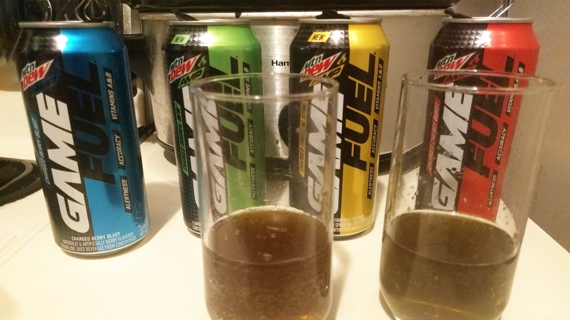 There are four flavors of Mountain Dew Amp Game Fuel, which I will now only call Game Fuel for the rest of the article. It’s easier. The four flavors are Original Dew, Berry Blast, Cherry Burst, and Tropical Strike. As I’ve already said on this website, I thought the Original Dew flavor was horrendous. But maybe these other flavors could change my opinion of Game Fuel? And now that I understand how to open the can, I won’t make a mess or annoy people on the internet for not getting how the weird cans work right away.