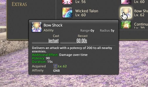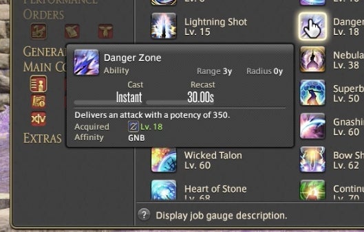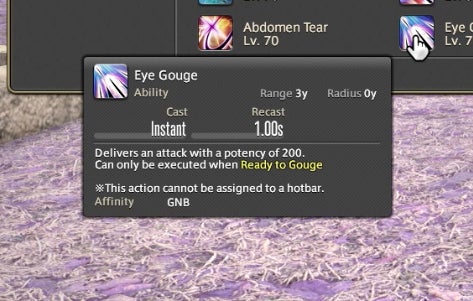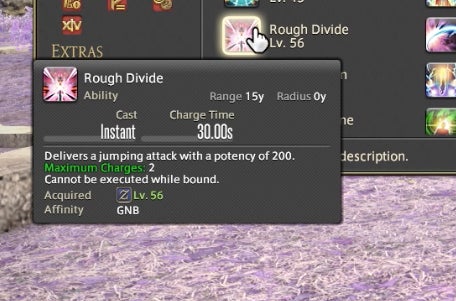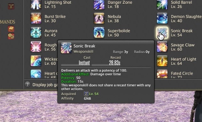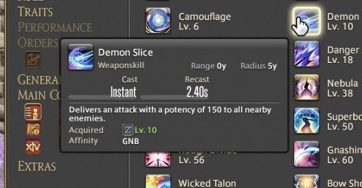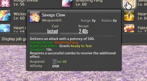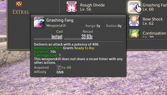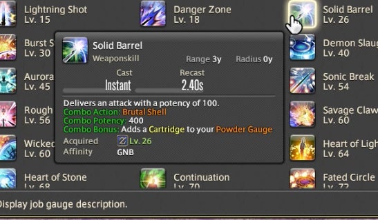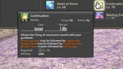 The Powder Gauge can store “cartridges” that are spent on special attacks. You earn cartridges by performing basic attack combos. Cartridges can be used on boosted versions of normal attacks—for instance, the circular Demon Slice can be replaced with the explosive spinning slash Fated Circle—or you can use them to access a long combo chain. That combo chain is what made Gunbreaker incredibly rewarding to play. This is thanks to an ability called Continuation.