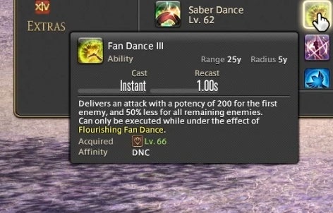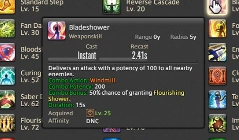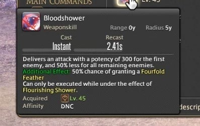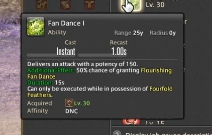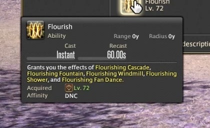 Dancer can also attack using a variety of long range single-target weapon skills and close range area of effect abilities. These abilities have a chance to trigger new attacks in a combo chain or, in the case of certain attacks, grant a resource called Fourfold Feathers. These feathers can be spent on powerful abilities that use the Dancer’s fan to strike with a magical burst. The idea is to attack and run through combos as they trigger, using Feathers on special abilities whenever you gain them. As a result, attacking as a Dancer is partially driven by random chance. You have a 50% chance of gaining Feathers on most abilities, so Dancers are required to react in the moment and improvise based upon their luck. A high level ability called “Flourish” enables all attacks regardless of if they’ve triggered, but it has a one minute cooldown. This means that you can sometimes cut loose and do whatever you like, at least from time to time.
