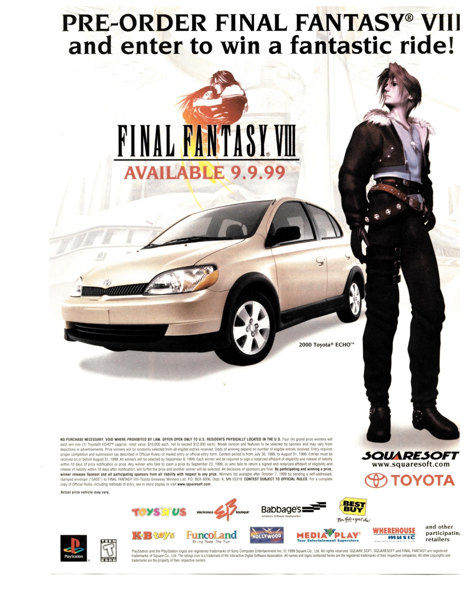 The seventh of these chapters concerns a marketing campaign Squaresoft executed back in 1999: pre-order Final Fantasy VIII, and you could win a car. And not just any car: it was an exceptionally bland car. It was a 2000 Toyota Echo