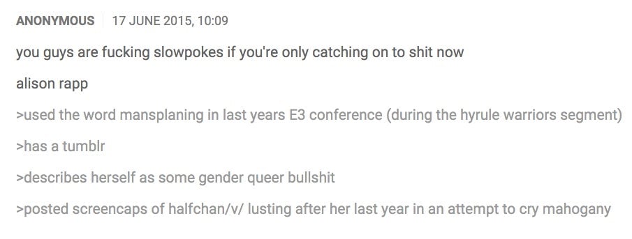 It’s unclear how or when Rapp became a target; she’s been with Nintendo over two years. The most vitriolic discussions happen within places like 4chan, where threads are regularly deleted.