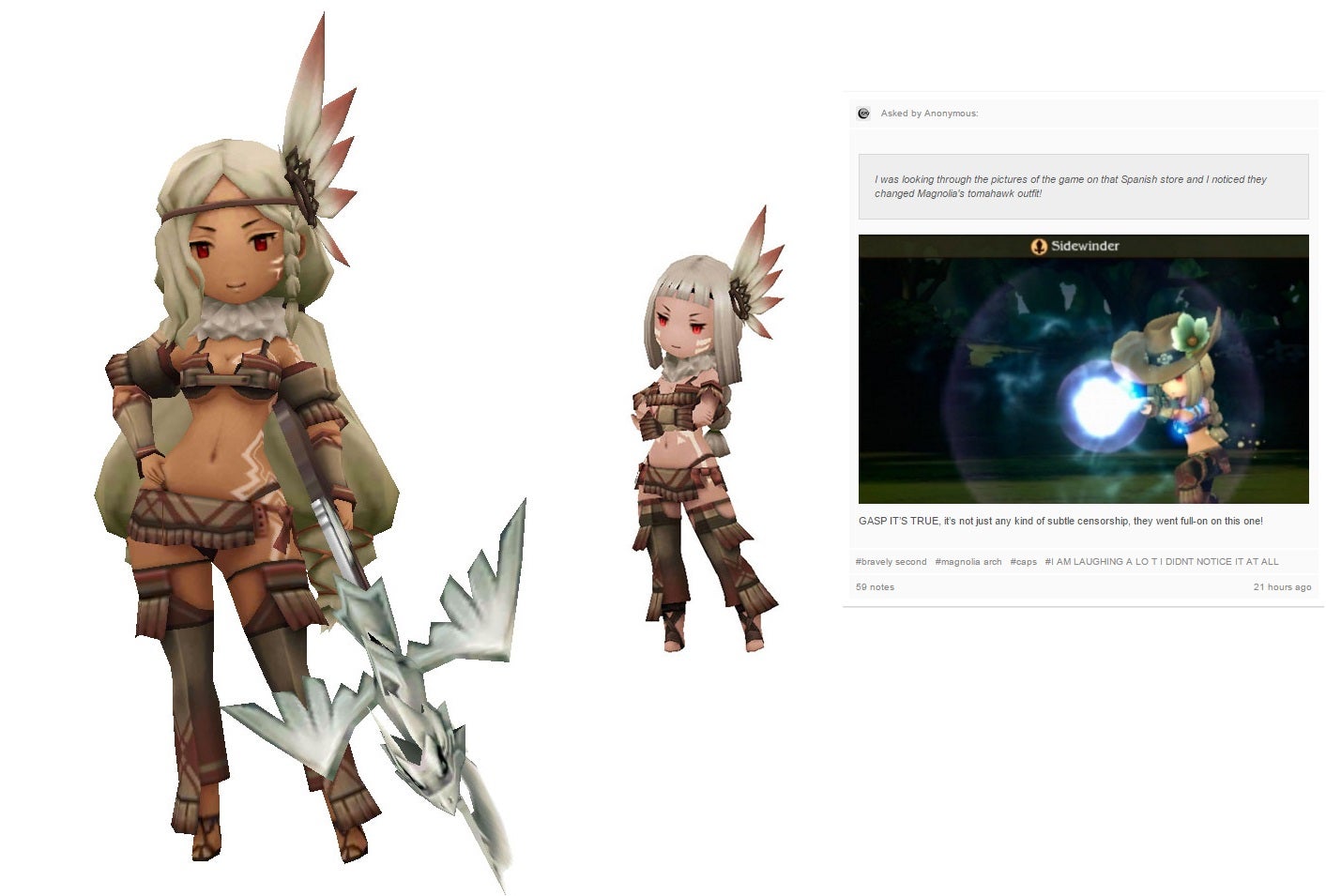 Most recently, it’s rumored that Bravely Second: End Layer was altered, with a Native American costume removed in favor of a cowboy outfit. We can guess it was changed to avoid criticisms of cultural appropriation—look no further than debate over NFL’s Washington Redskins—but since Nintendo didn’t respond to my request for comment, I can’t say anything for certain.