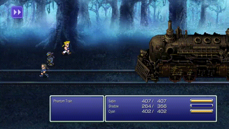 Each character has a unique command ability, such as Terra’s Trance, Locke’s Steal, Edgar’s Tools or Sabin’s Blitz, and can also learn Magic spells from earning AP from battles with magicite equipped. Each character’s rare Desperation Attack will randomly activate after using the Attack command when at critical health.