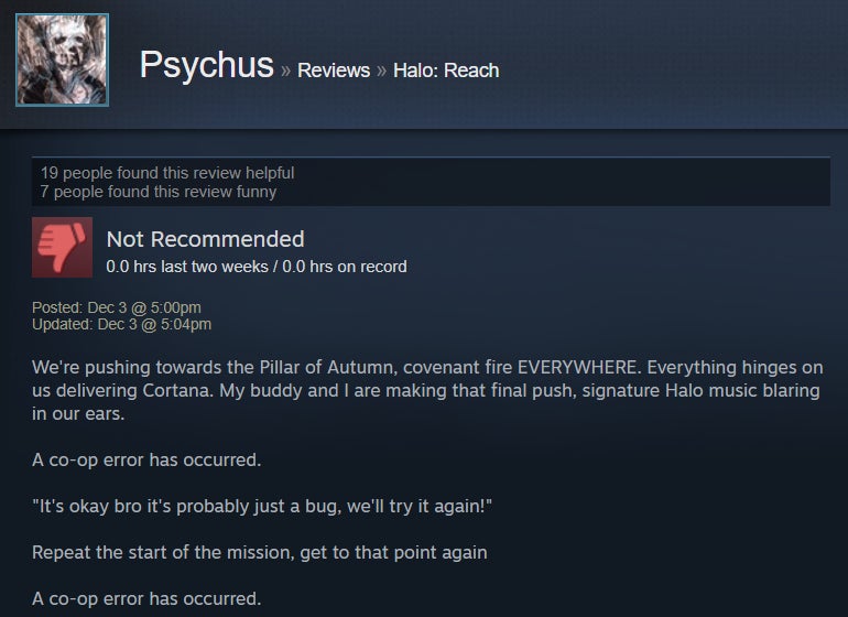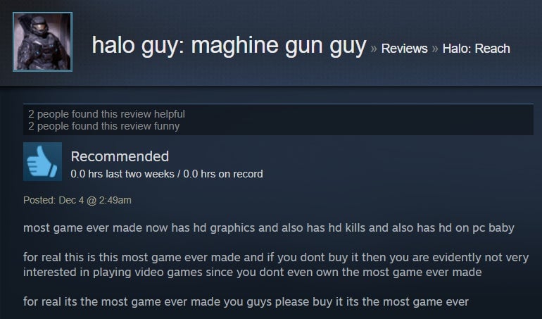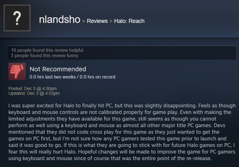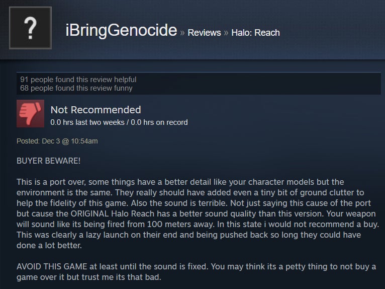 For the most part, Halo: Reach’s PC port is a case of “what you see is what you get.” It’s Halo! The one subtitled Reach, specifically! Now, though, it’s in 4K and can run at 60+ frames per second. Many Steam users are luxuriating in the bubbly, warm nostalgia that accompanies cracking open a 2010 shooter about a squad of extremely doomed space marines just trying to do their best (something we can all identify with). The port, however, isn’t the most elaborate, and it’s got some issues in the control and audio departments. Steam users have also been outraged to find that Reach on PC doesn’t have splitscreen co-op, and frankly, I can’t blame them. I mean, it’s Halo, people—come on.