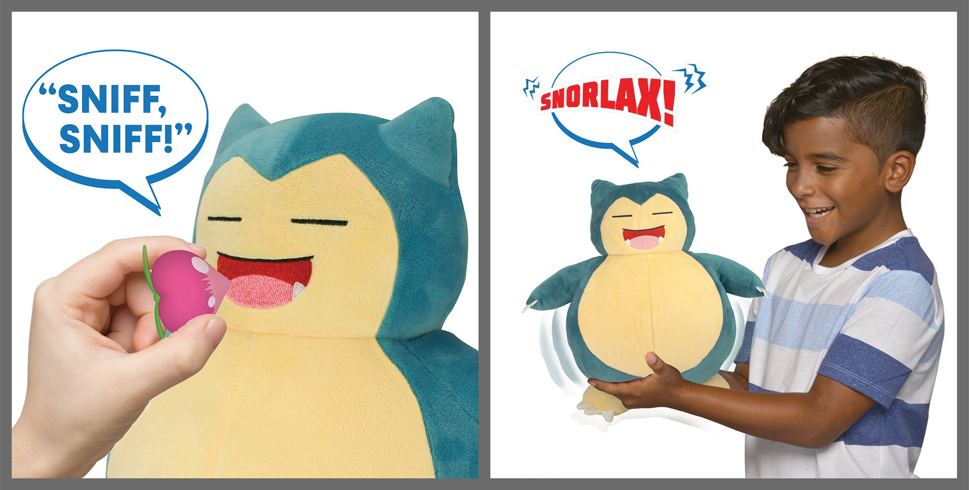 It’s sort of like that. Snooze Action Snorlax is a 10-inch, $30 plush with two modes of play, “Snooze Mode” and “Awake Mode.” In Snooze Mode, Snorlax yawns and snores and lies there, blocking important Pokémon trainer routes. Feed Snorlax his included Pecha Berry accessory and he enters Awake Mode, where he is much more aware of his fellow Pokémon’s needs and the issues affecting them. Or maybe he just makes different noises.