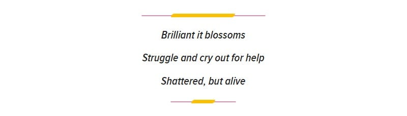 “’Brilliant it blossoms’ might be suggestive in haiku, but it would relate to something actually brilliant in blossom, perhaps a flower, or flowering tree, and that would be your first image, most likely followed by the kire (which might be a dash or a comma or a period, or simply the end of the line),” Kacian explained.