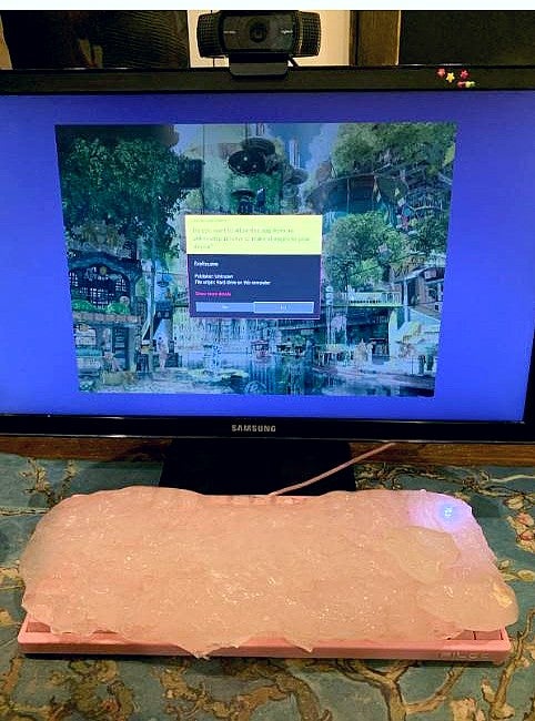The slime had seeped into the keyboard, filling the spaces between the keys with ooze. It had looked so solid and congealed just minutes ago, and now, it was practically dribbling deep into my pink Filco mechanical keyboard. I freaked out. So of course, I made another bad decision: going into the kitchen and getting a knife. It took ten minutes of meticulously removing the slime with a small blade before it dawned on me that, really, the best thing to have done was just turn the keyboard upside down and let the slime seep out on its own. Oops.