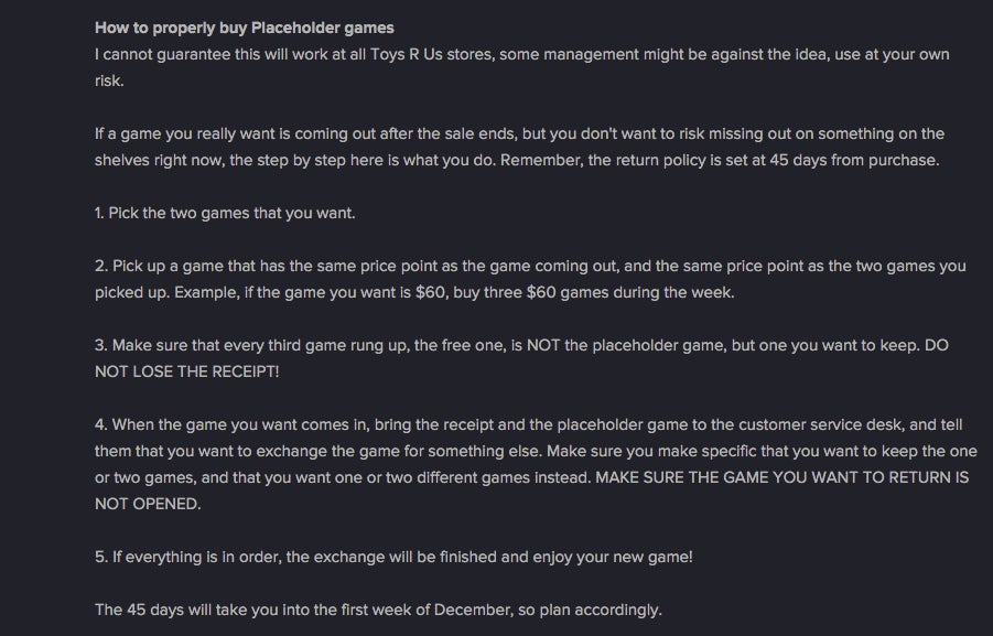 The next year, I put out the definitive FAQ of the promotion. Posteda mere nine days before the sale started, it appeared on the internet continually until the sales ended in 2013. It contained a detailed explanation of how the sale worked at the register. I also shared a placeholder strategy that my coworkers and I had come up with over the years to swap out games after the sale ended. My strategy involved encouraging consumers to return products after the sale. There wasn’t a process in place at the time to stop this from happening, but it definitely violated the terms of the promotion. Toys “R” Us would definitely not look too kindly on customers doing it, much less if they knew that store employees had put the idea in their heads.
