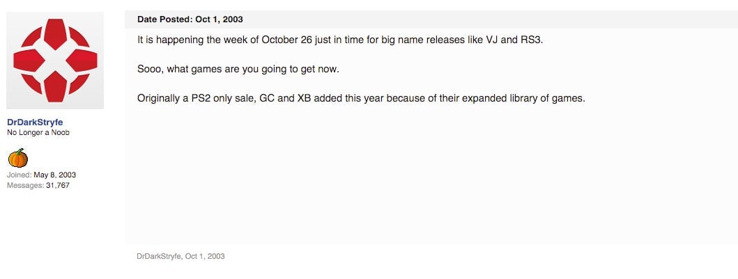 I leaked the sale for the first time on October 1, 2003 in a post that revealed the sale would begin on October 26. The content of the post was slim. All I really had was the date, which I found out off-hand from a manager’s meeting, and the systems that would be eligible for the promotion. I trusted the information, though, so I tossed up the post on the old Gamecube General Board at IGN. I thought I was doing a service.
