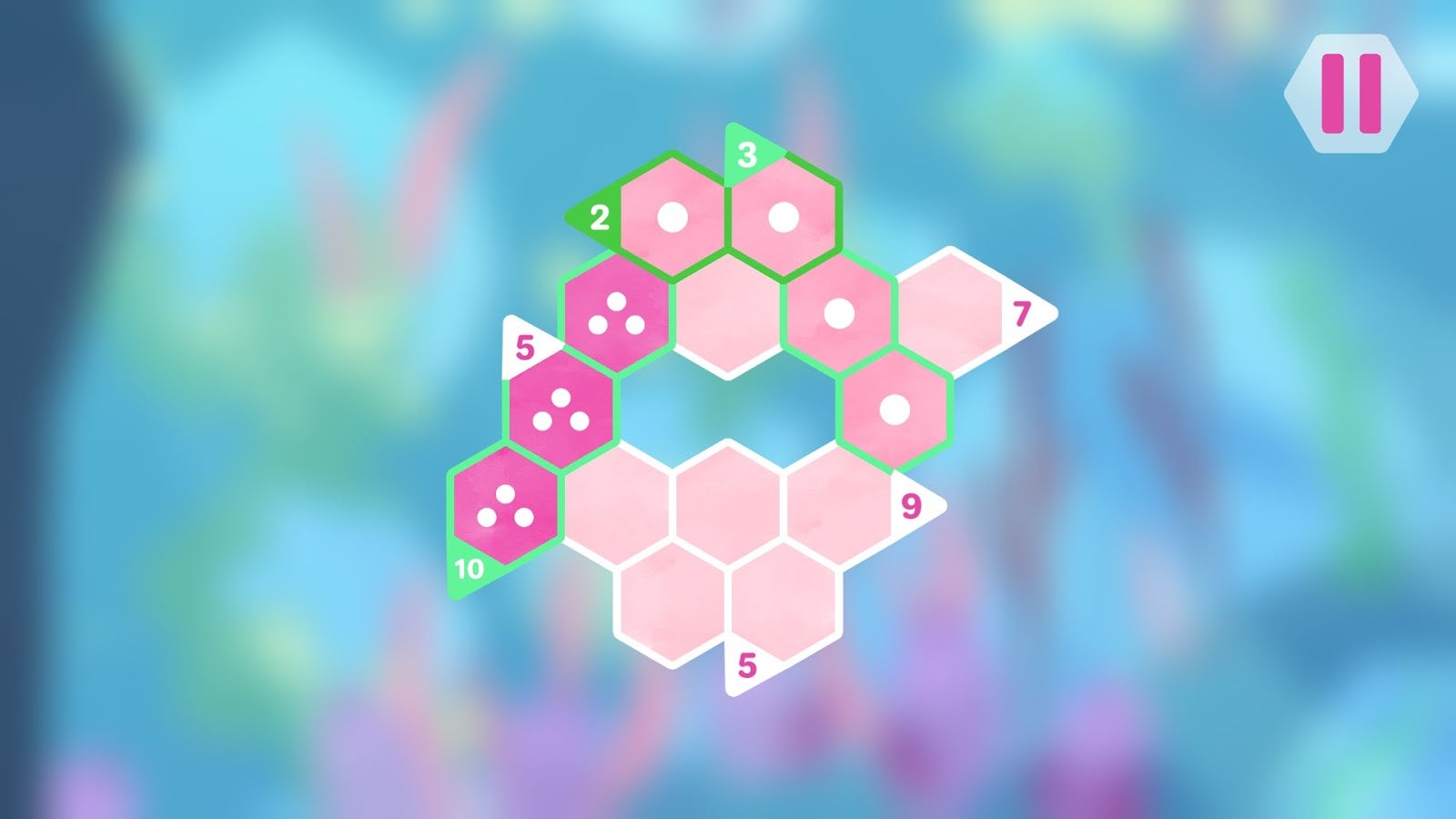 And I am swept along a stream of increasingly complex number logic. I am never overwhelmed, but never bored. I feel quite clever, actually, which is what a good puzzle game does. Four hexes that must add up to ten, but one space already has a single dot in it? Why, that leaves three groups of three dots. What a clever lad I am.