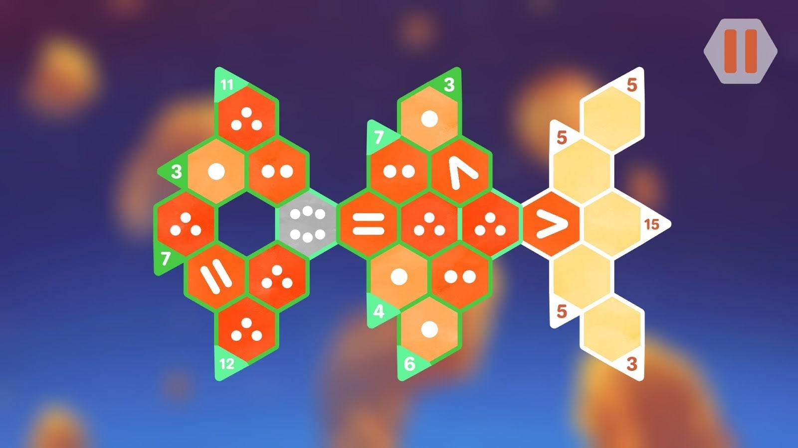 Level three primes the mind for what’s to come, and by that point, I have started assembling rules in my head. Any two hexes that must add up to five will be a combination of two dots and three dots. When any combination of hexes add up to the number three, none of those hexes will contain three dots. So when I get a level with a number three next to a number five, the answer is obvious.