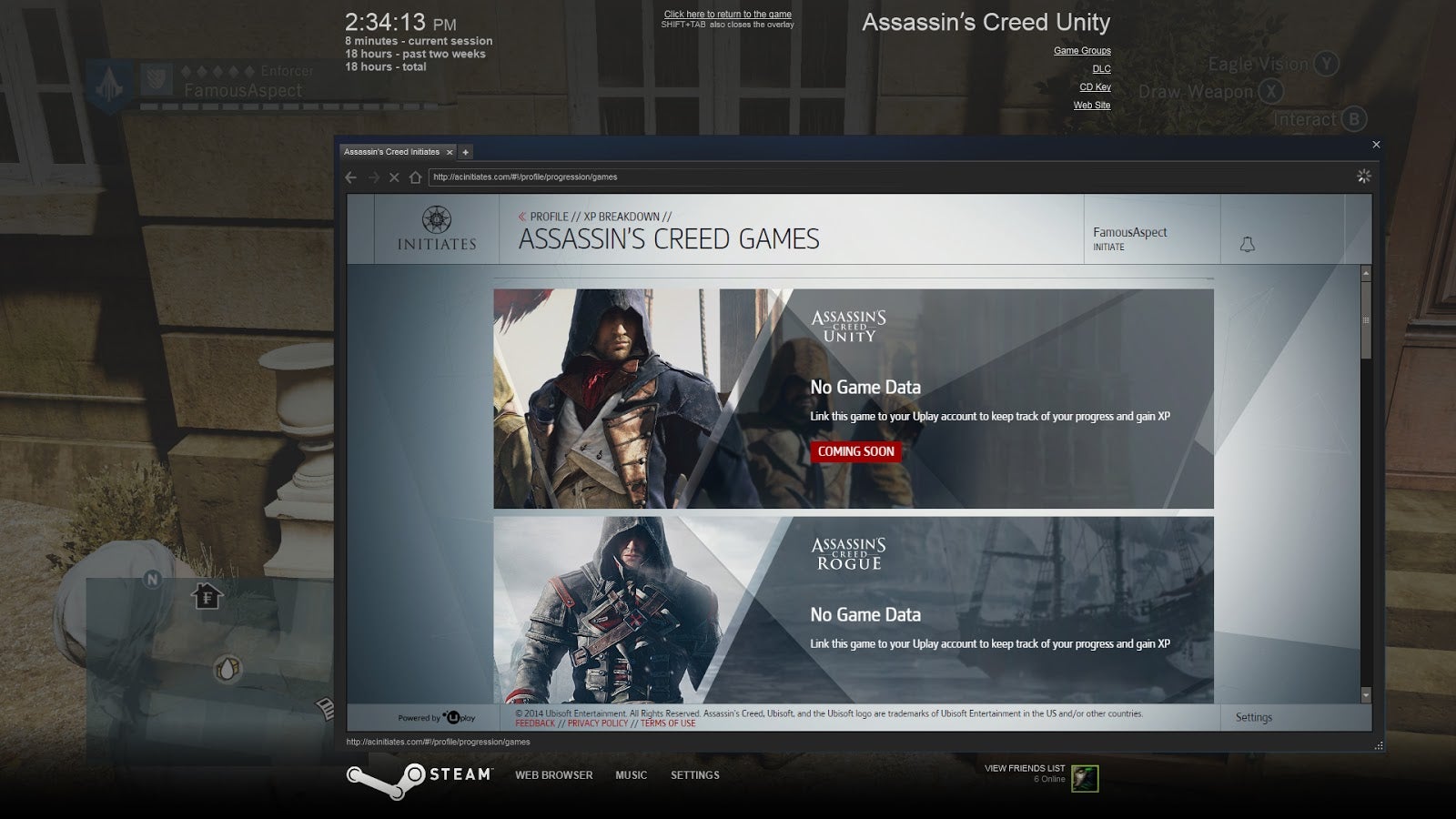 Later I would go back to try and figure out just how to level up in Initiates. The webpage I pulled up marked the ability to “keep track of my progress and gain XP” as Coming Soon. At that point I wrote off the idea of opening up a single yellow chest. (Note that Ubisoft finally got that feature working over the last 24 hours, nine days after the game was released. It lists me as a level 2 Initiate and notes that I’ve started the game’s story, even though I’ve finished it. Another Initiates feature, “Daily Drills,” is still listed as Coming Soon.)