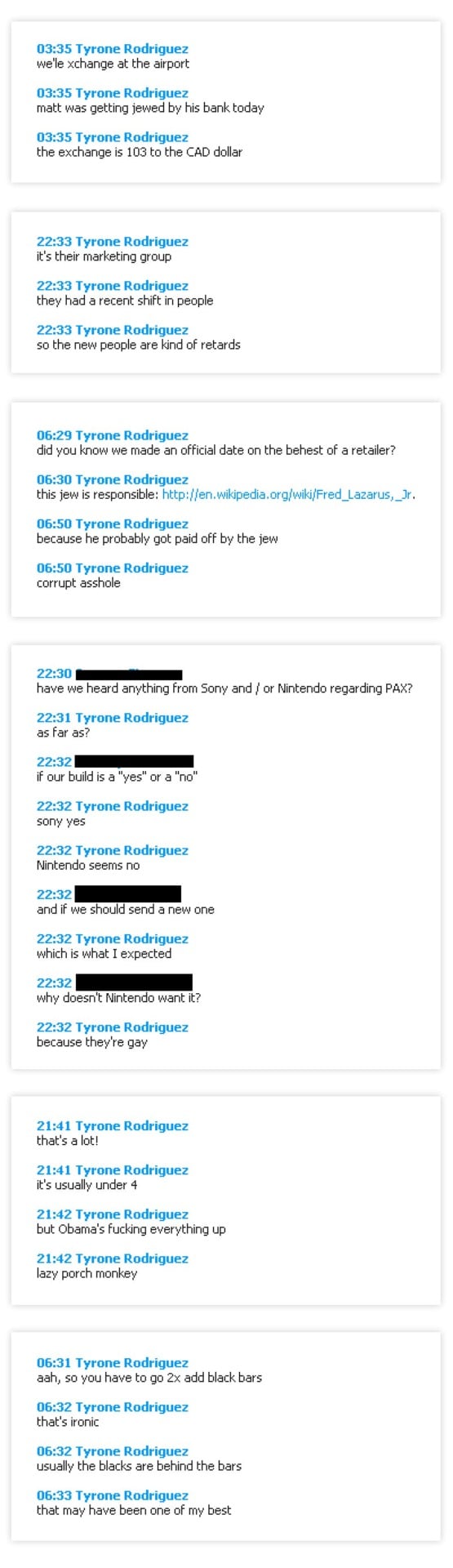 One Skype log shared with Kotaku by a former Nicalis employee shows Rodriguez calling external partners âretardsâ and his employees âyou gays.â In another Skype exchange shown to Kotaku, an employee talks about watching Star Trek and Rodriguez says, of Jean Luc-Picard, âI like that nigger.â Two other former Nicalis employees said that Rodriguez would, as a goof, encourage one employee to use the n-word in Skype group chats. Said a third, when I asked: âI havenât experienced anything like Tyrone demanding people use racial slurs, but he likes to say âwhite is rightâ often in a âjokeyâ way.â