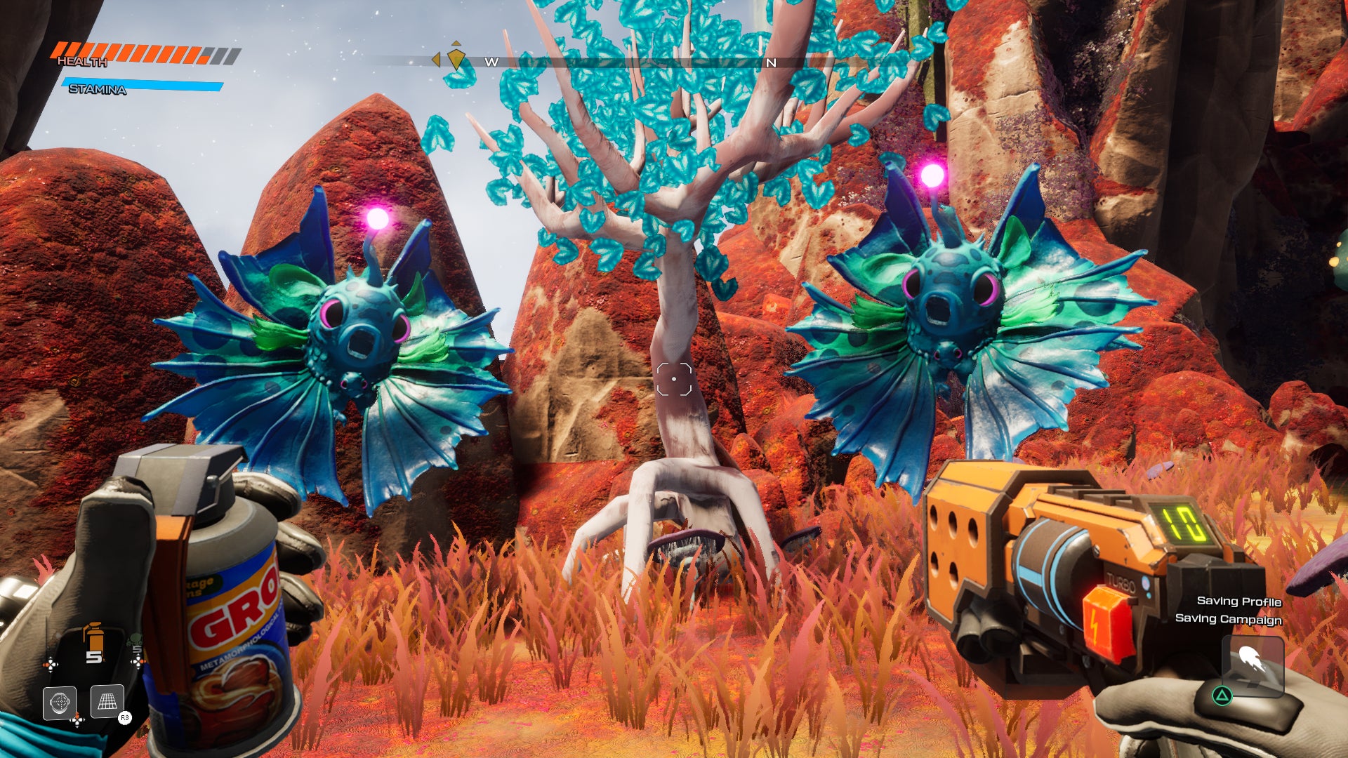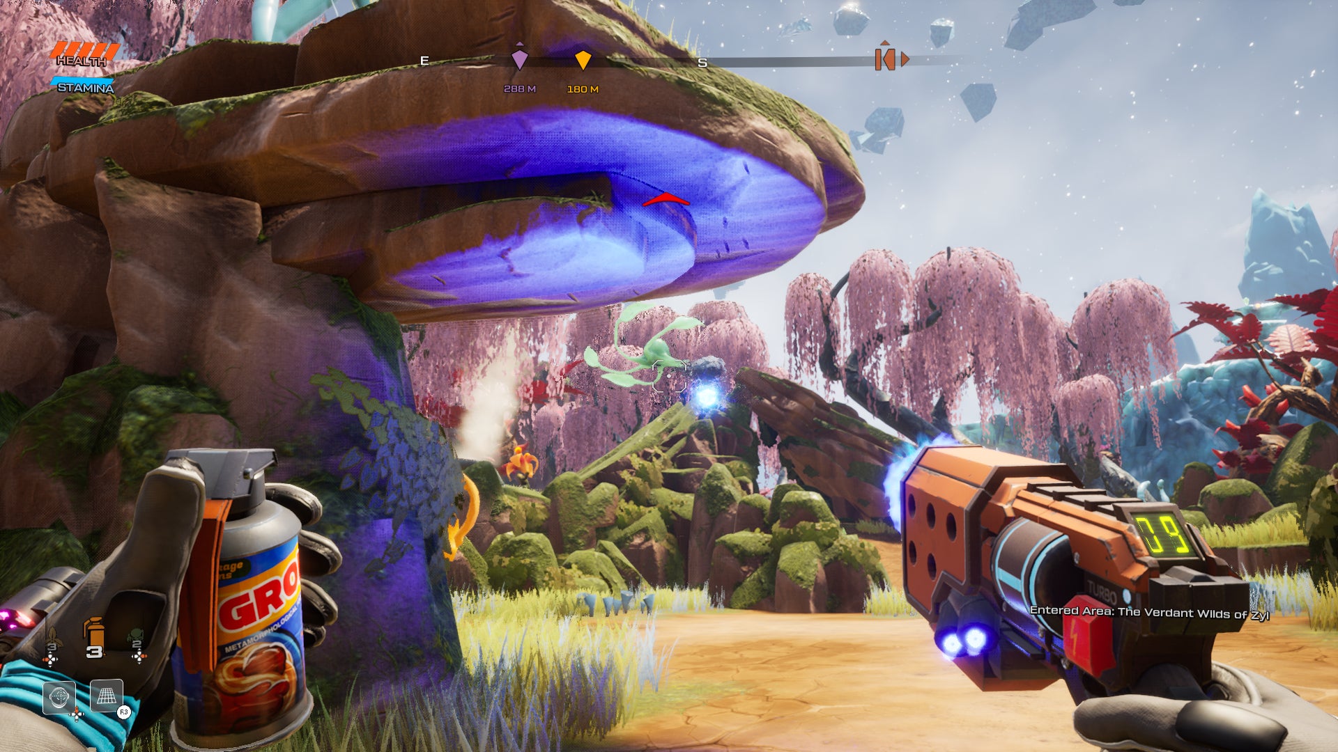 Do you enjoy seeing goo in your video games? Hopefully, you do, because Savage Planet is overflowing with alien goo. A lot of the systems in the game involve goos of various colors. Orange goo pods are hidden around the planet. Smashing them into your face rewards you with more health and stamina. Purple goo can be collected and tossed at enemies to stick them to the ground, making it easier to shoot them. Enemies pop open when killed, blasting the area with goo. Things get gross but in a cartoonish and colorful way. This tidal wave of neon goo also highlights how vibrant Savage Planet looks. Nearly every biome has a distinct palette of garish colors like a cover of an old sci-fi novel. Creatures are covered in pink, lime green, and purple skin. The mountains are different shades of red and yellow. It’s all so lovely and disgusting, but in a good way.