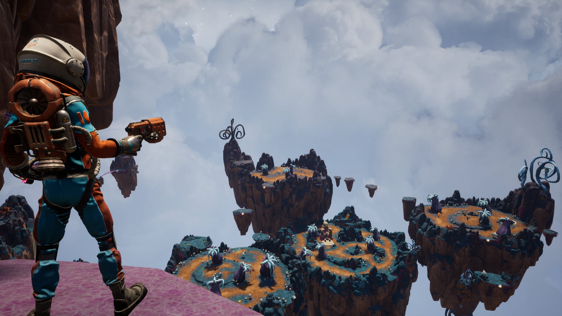 AR-Y 26 is broken into a few biomes, each made up of smaller areas. Each section of the planet contains different creatures, plant life and places to investigate. You’ll explore snowy caves filled with cute and fluffy birds, big desert areas where dangerous alien-lizards roam about and even weird floating islands made rock and mud. As you explore you will encounter weird animals and plants. This is not a peaceful process.