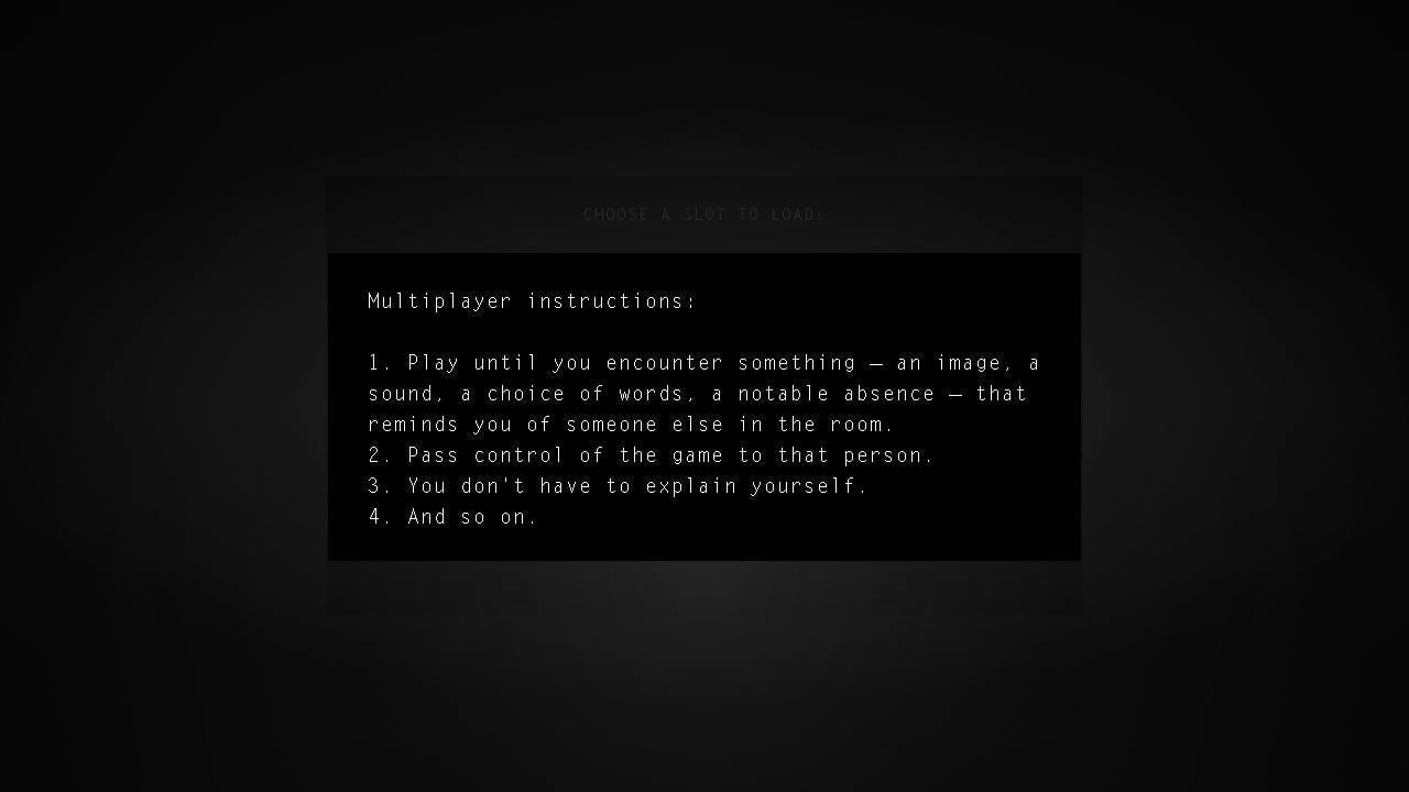 In Kentucky Route Zero’s menu, you’ll find an option for multiplayer. Clicking on it gives you these instructions: