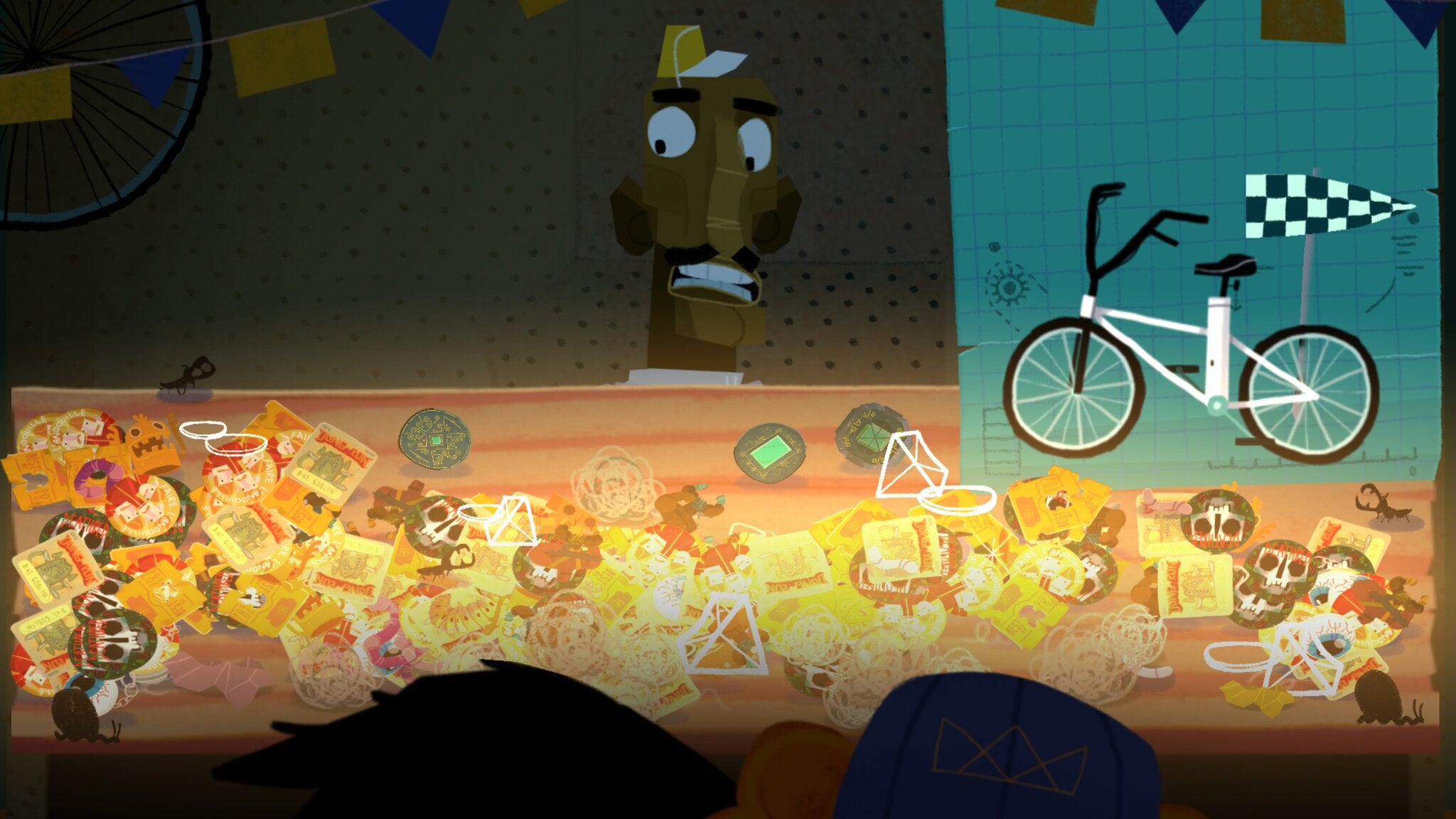 Both bikes can be customized by spending the odds and ends you collect from bushes, enemies, and hidden chests. This detritus shows up in the world as glowing lights that you must scoop up. It’s somewhat tedious, but the collecting feels satisfying when you look at the drawings on the side of your screen showing what you’re actually collecting: stickers, bread clips, worms, and so on. When you buy bike upgrades, the girls heap this pile of junk in front of the bike salesman. Why the salesman is willing to accept garbage in exchange for bike flags and handlebars is left to the player’s imagination. Necessary upgrades, like tires that can go through mud, are given to you for free, but it’s fun to change the color and decoration of your bike.