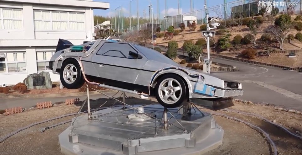 Students at Tanabe Technical High School in Wakayama, Japan have spent over four years making a DeLorean replica out of 2-millimeter-thick aluminum. The monument is located in front of the school, and four times a day during the week, it slowly spins around as the Back to the Future theme song plays, with the okay…