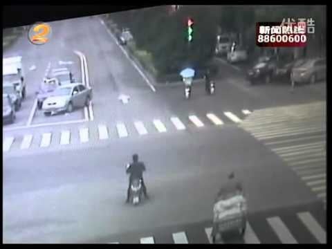 Last week in China’s Zhejiang Province, five people riding the same scooter were sideswiped by a sedan. The riders suffered injuries to various degrees, but thankfully, they were not life threatening and everyone survived. The video went viral in China and appeared on Beijing TV program Traffic Light (红绿灯), which has a segment called “Accidents…