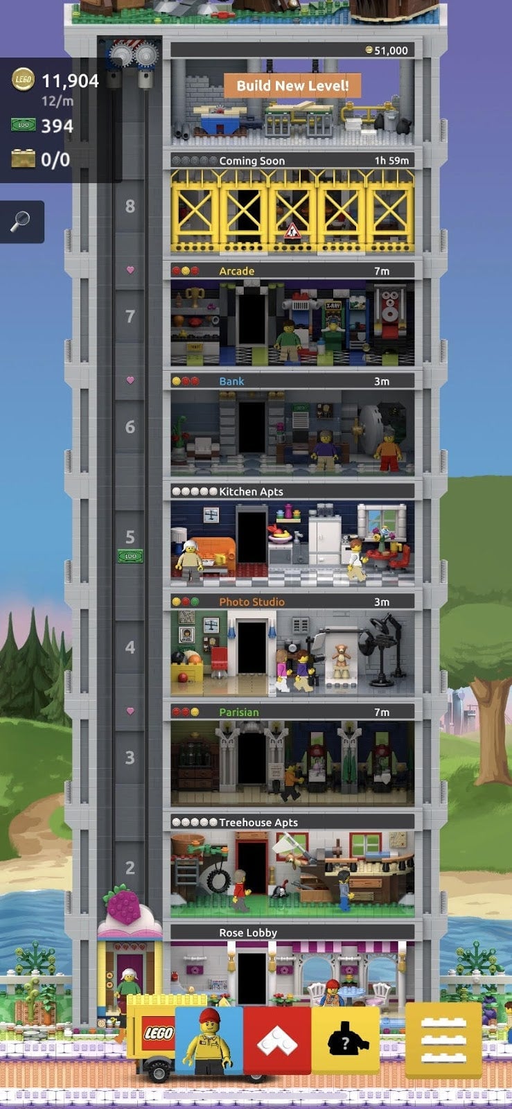 Lego Tower, out today on iTunes and Google Play, is all that and a bag of bricks. Instead of NimbleBit’s Bitizens, the virtual people are Lego minifigures, and players can collect different pants, shirts and heads to change their figures’ appearance. The tower background, lobby and roof can be customized with different Lego themes. It’s bright, shiny and happy. I have only just started my tower, yet I am already quite pleased.