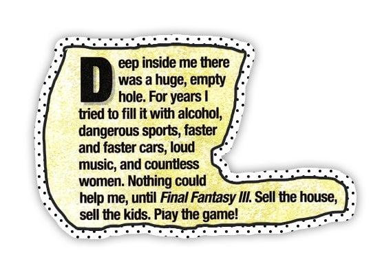 To say I’d been “following the news” about Final Fantasy III would be like calling a serial killer a “bad person.” I had literally two things in my life: anger that Squaresoft wasn’t translating Final Fantasy V and hope that Final Fantasy VI would arrive soon and become the meaning in my life. I’d memorized the exact geometry of every screenshot. I’d written reams of fanfiction in my head about the character sprites. I wore sweatpants and ate macaroni and cheese every day.