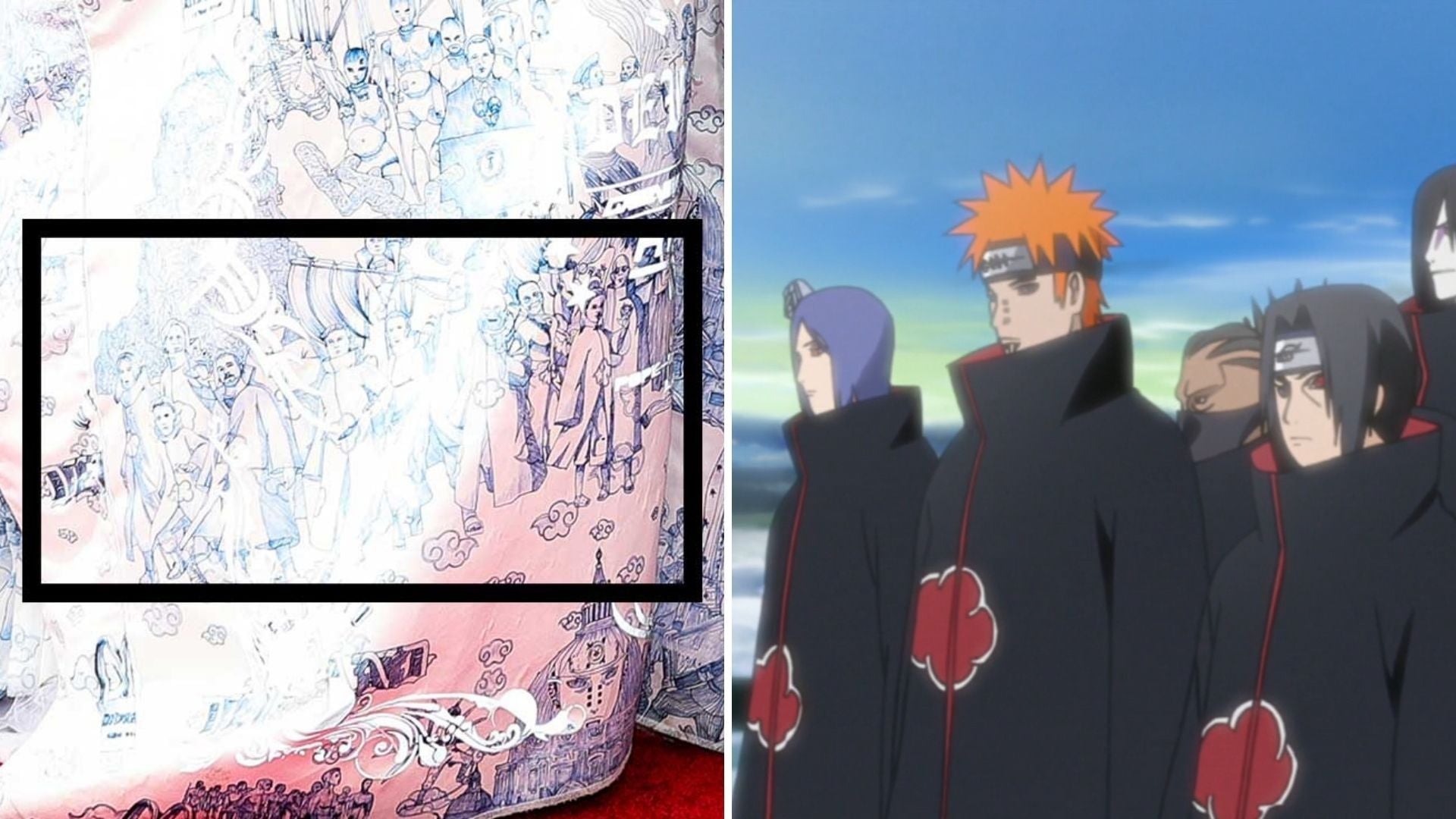 The rapper, long may he reign over the sulphuric halls of Satan, appeared on the red carpet wearing an outfit created by designer Andrea Grossi. At first glance, the corset top and skirt-like bottom flanked by huge, voluminous panniers (or side hoops) would send even Marie Antoinette into a cake-fueled rage. But upon closer inspection, one can see that some of the faces and characters on the blue and white skirt look like they came straight out of Konoha. In the upper right section of the skirt, there’s a pierced face that looks like Naruto villain Pain, and, just slightly below the face, there are a number of characters dressed in robes that resemble the black and red cloud robes of Akatsuki members.