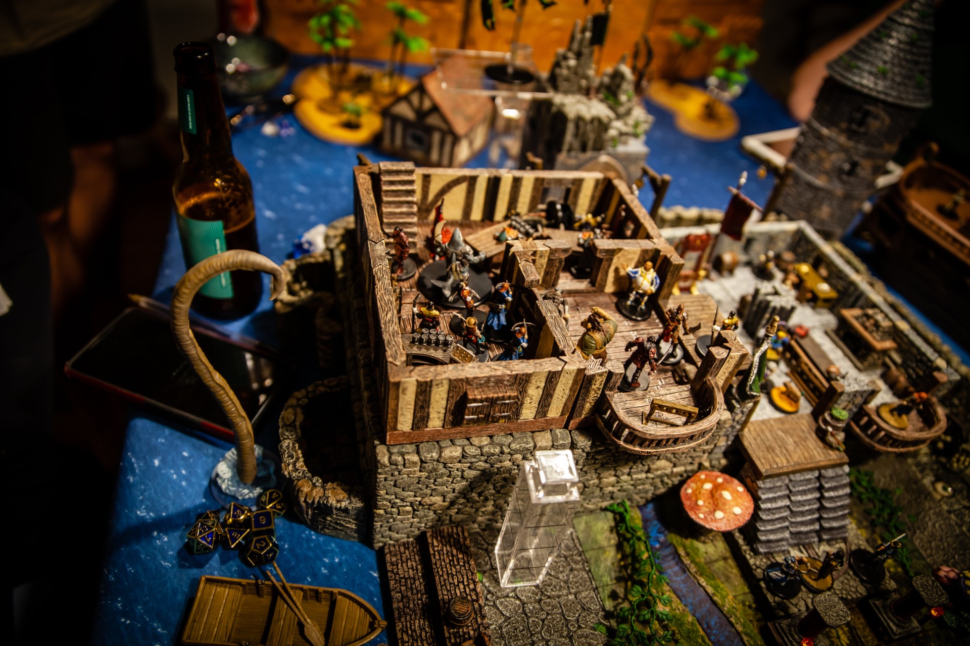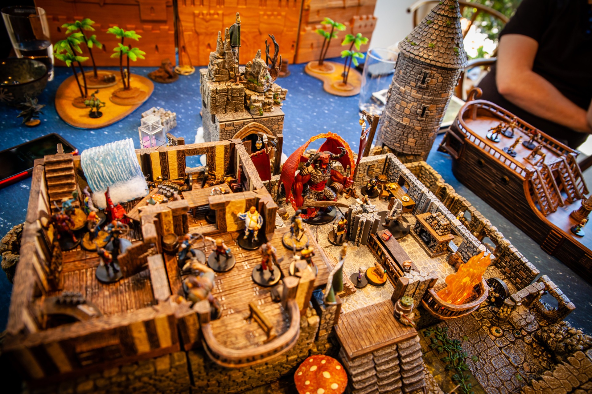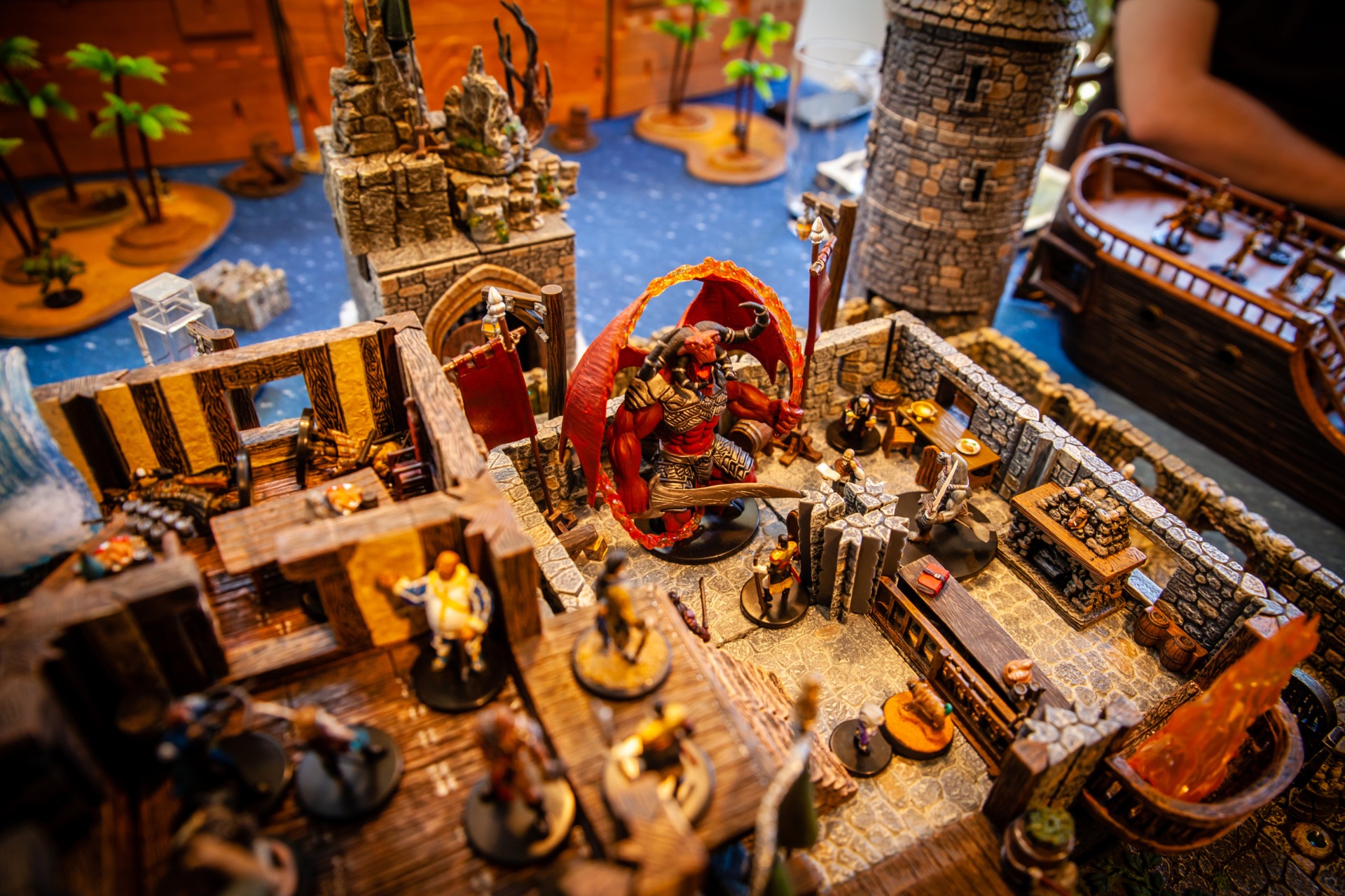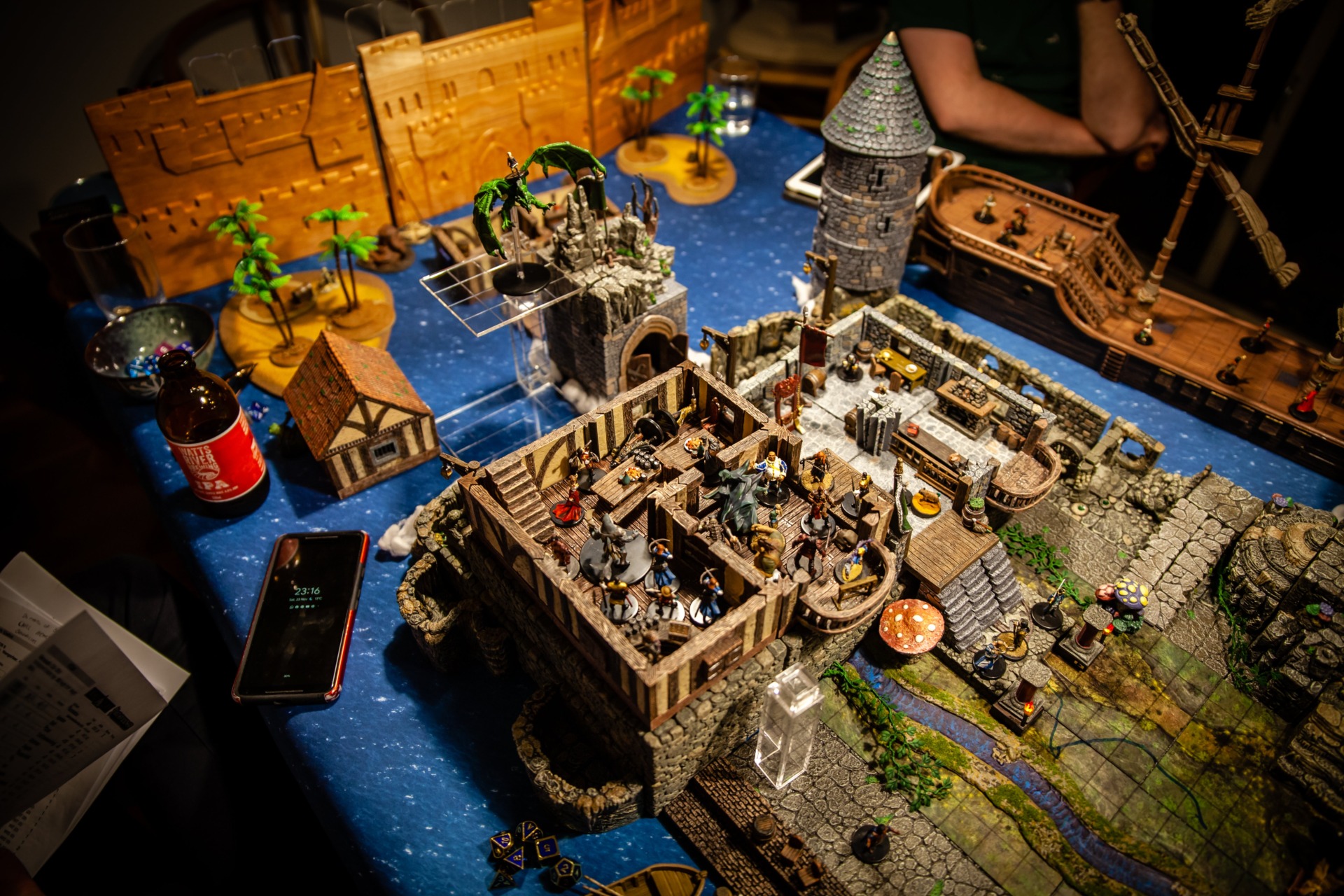 Overseen by DM Paul Houlihan, who also did all the painting (the terrain is a mix of stuff, most of it from Dwarven Forge), the party (Persimmon’s Hate) can be seen here wrapping up a 15-hour session to conclude the second of six books in the Skull & Shackles campaign