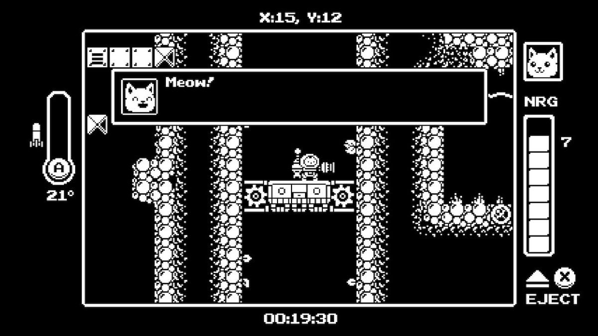 Guided by grounded Gary via a comm device, Kiki the cat mech collects weapons and suit upgrades, many of which allow her to explore deeper into the facility. Missiles blow away rocks, removing early barriers. The suitās dash upgrade lets Kiki warp through falling lava.