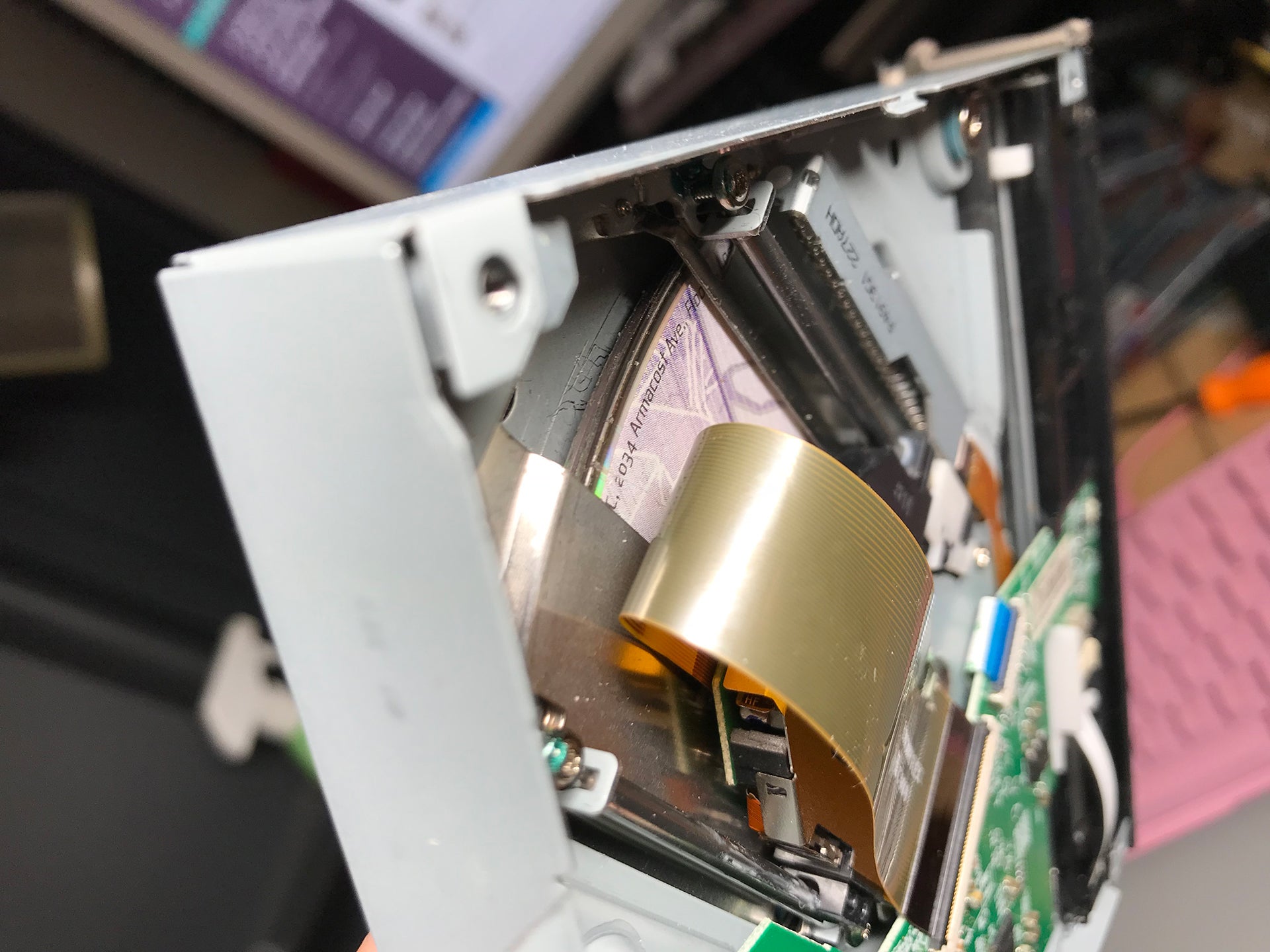 Aside from a single tricky ribbon cable at the front of the unit and irreversibly stripping three of the screws holding the top of the inner shell to the bottom, the teardown went pretty well. Once inside the console, all I had to do was pop off a couple of cables and pull out the Blu-ray drive. Removing its metal casing, the problem became clear. There were two discs in the drive at once.