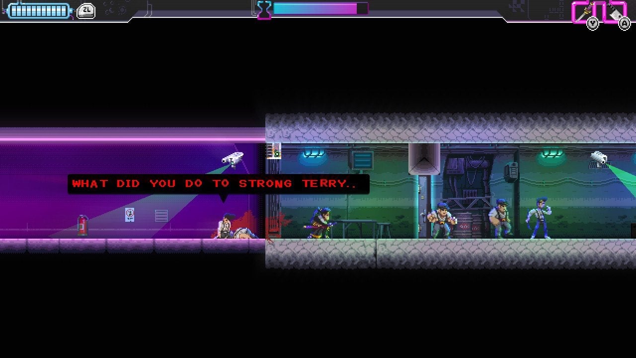 The game does have several smart little touches that more successfully made me care about Katana Zero’s world. Its narrative is excessively dark most of the time, but it balances its tone with humor that is, well, still pretty darn grim. This brings us back to Strong Terry. If you chill outside of rooms before charging in and severing tens of heads from an equal number of necks with balletic grace, enemies will sometimes chat amongst themselves. In one of the game’s early levels, I overheard two baddies arguing over who’d win in a fight: me, the ruthless killer who’d been devastating their ranks, or Strong Terry, the tough guy with a heart of gold who never skipped leg day. I figured he’d be a boss or something, perhaps later in the game.