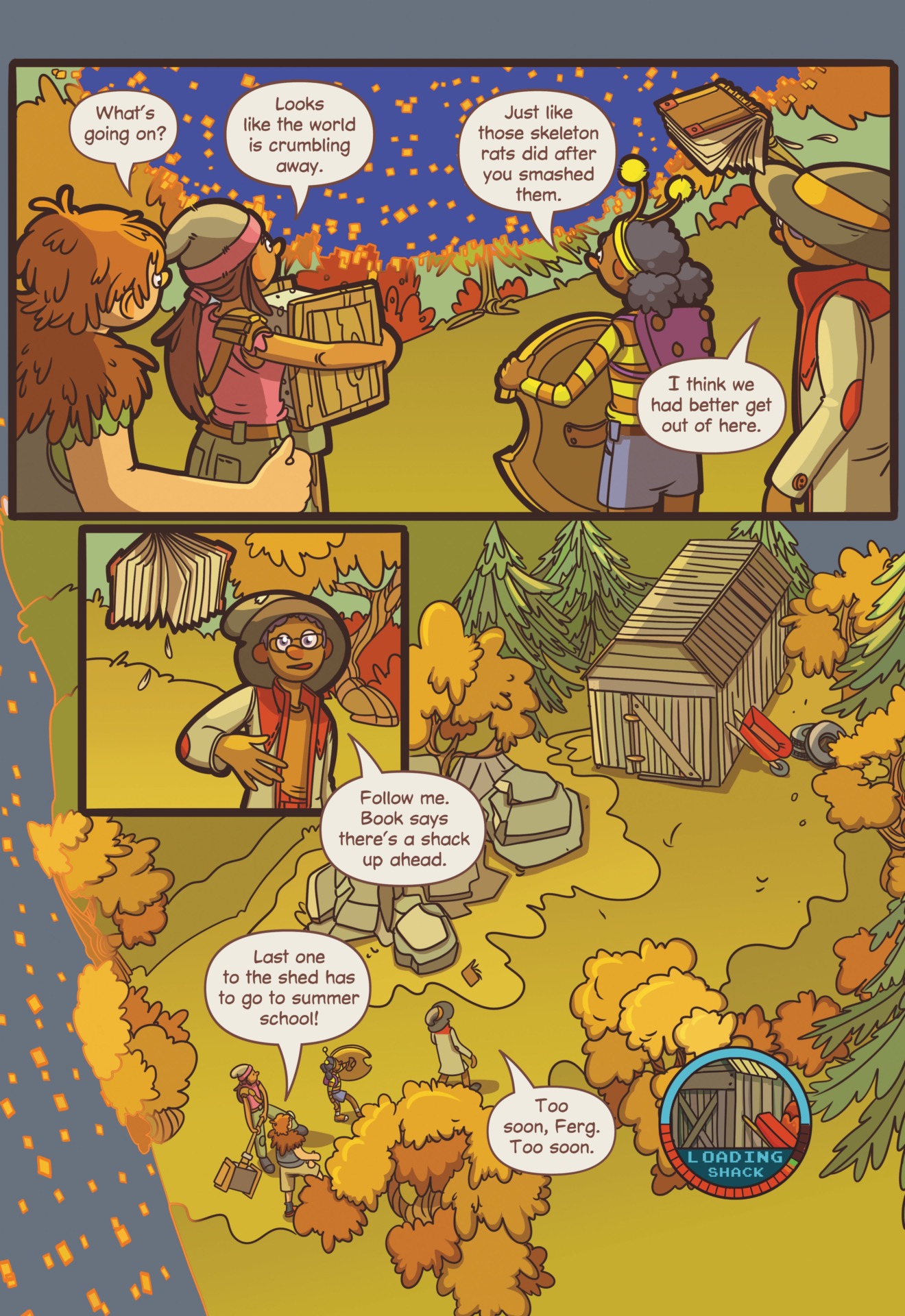 In My Video Game Ate My Homework, a new middle-grade graphic novel from DC Comics and writer/illustrator Dustin Hansen, 13-year-old Dewey Jenkins’ science project is sucked into a malfunctioning virtual reality game console. Dewey and friends must navigate a digital role-playing adventure to retrieve the project and save Dewey from summer school. Check out an exclusive preview of the feel-good comic book adventure below.